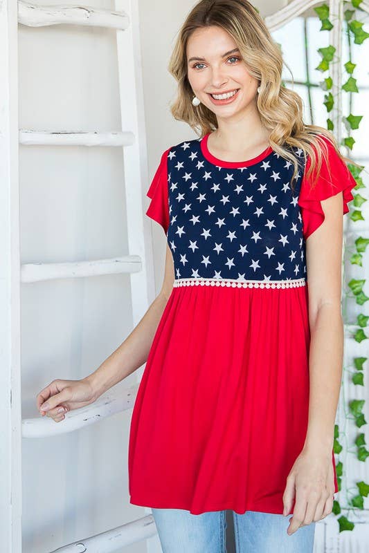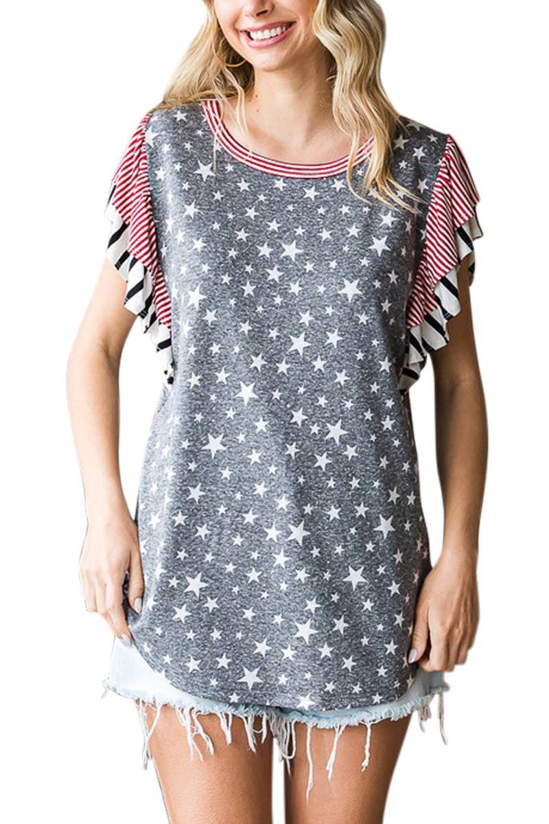 Star Print Stripe Accent Double Ruffle Short Sleeve TopT5232