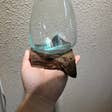 Hand-Blown Mini Terrarium on Natural Driftwood Base Bring organic elegance to your assortment with this hand-blown glass terrarium, delicately perched on a sculptural piece of natural driftwood. Each piece is uniquely formed, with molten glass flowing over the wood’s contours to create a harmonious blend of texture and transparency. Ideal for air plants, moss gardens, or minimalist floral accents, this tiny terrarium adds a touch of nature-inspired artistry to any space. - Artisan-crafted; each piece is one-of-a-kind - Smooth, clear glass with soft organic shaping - Mounted on sustainably sourced driftwood - Perfect for small plants, seasonal displays, or sculptural decor - A versatile accent for home, garden, or boutique retail settings This petite showpiece invites creative styling—whether nestled into a shelf vignette or featured as a tabletop centerpiece. *All glass is handblown and organically imperfect, may have bubbles, lines, discoloration and marks. That is what makes it beautiful! Dimensions: All Terrariums will vary in dimensions. Glass Approximately: ~5in W x 4in H~ Wood Approximately: ~6in L x 5in W~