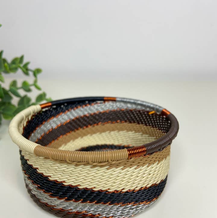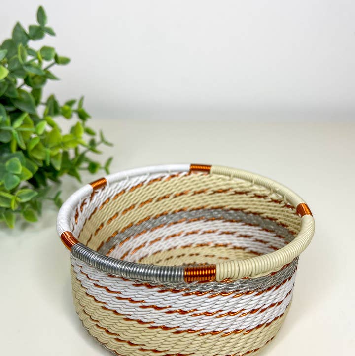 This decorative bowl is hand-woven out of telephone wire. It is traditional zulu work and it is made from coils of telephone wire wrapped around a solid metal core, to define its shape. It has a modern twist to its make with the infusion of bright colour patterns. The intricacy in the design makes this bowl so precious due to the long production days involved in its design. No two pieces are the same. Designs may vary, making each individual piece that much more unique. Perfect in the office, as a catch-all for desk accessories, or by your bedside for jewelry. Multipurpose Catch all for accessories. Made out of coils of telephone wire wrapped around a solid metal core. Colorful. Modern twist to traditional weaving. Intricate design due to long production days. Wash gently with warm soapy water. Diameter: 10cm. Height: 4cm.
