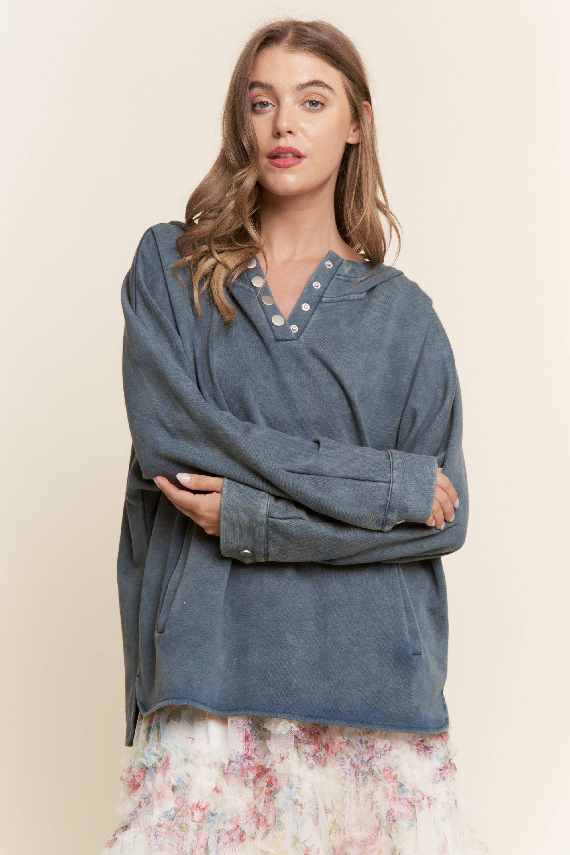 Mineral Washed Henley Waffle Raglan Sleeve Top