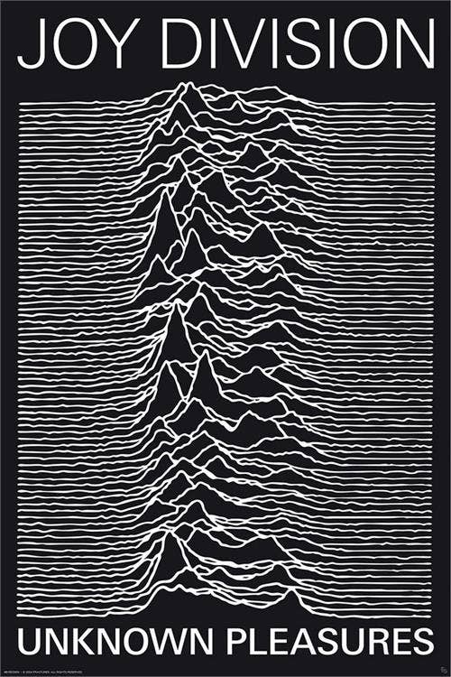 The "Unknown Pleasures" poster, featuring a series of white lines depicting pulsar radio waves against a black background, was inspired by the cover art of Joy Division's 1979 album of the same name, symbolizing the band's enigmatic and atmospheric sound. Size 24X36.