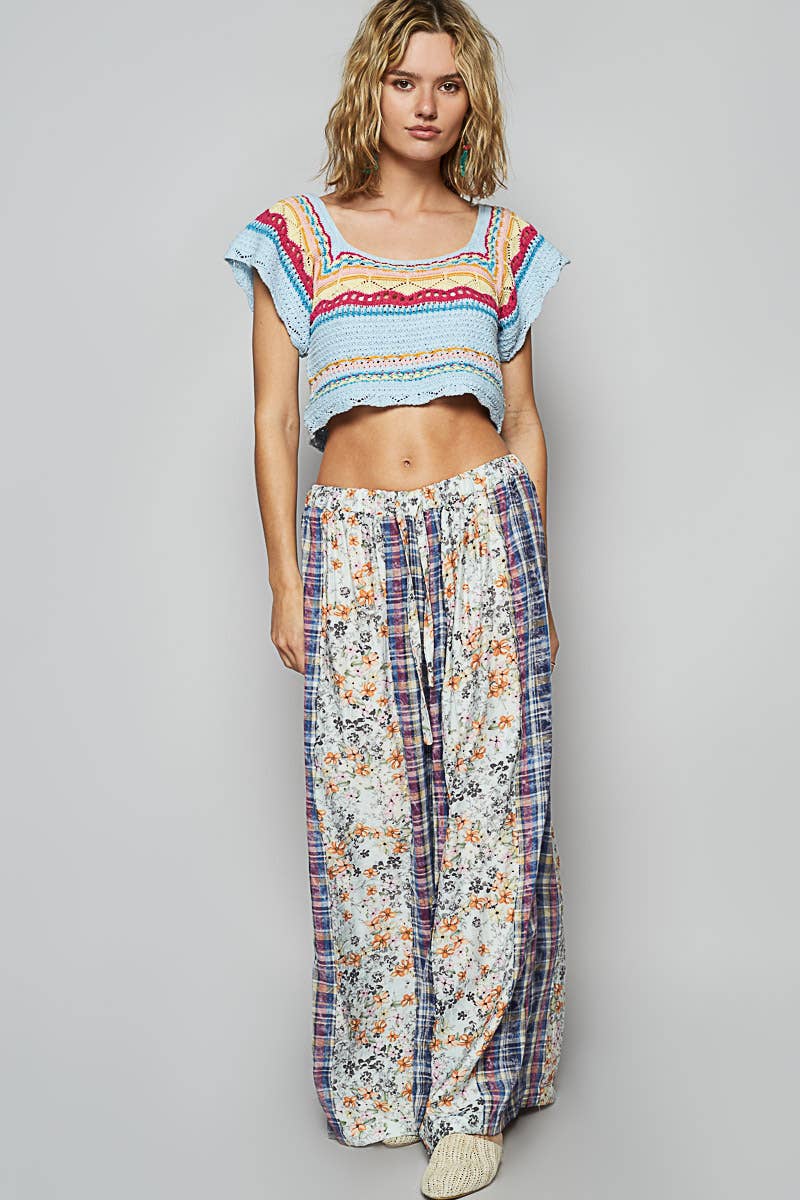 Designed in floral patchwork relaxed fit pants in denim with embroidery detail. Specs/Dimensions: - WAIST: 14" - RISE (BAND INCLUDED): (F) 12-1/4" / (B) 14-3/4" - INSEAM: 30-1/2"