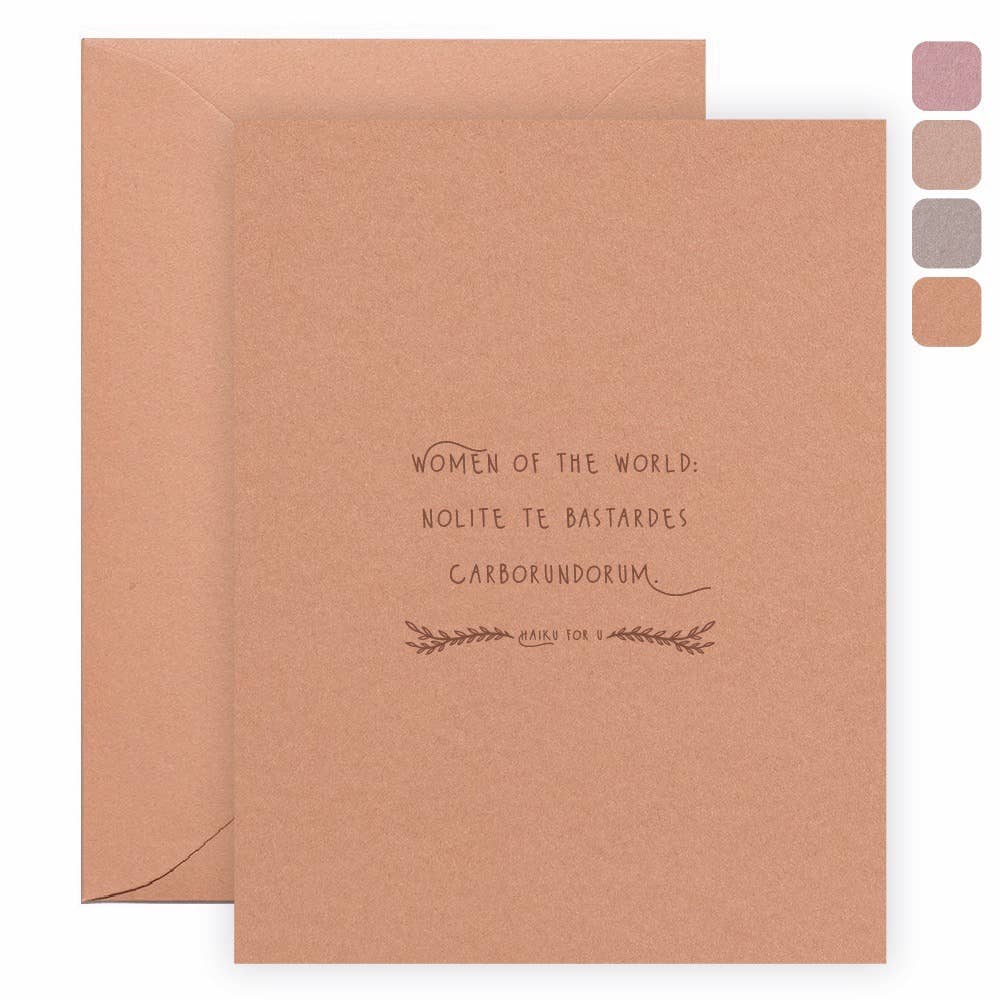 Front: How mad will you be Learning this birthday haiku Is your only gift? Haiku for U Size: A2 Greeting Card (4-1/4″ x 5-1/2″) Paper: 100# vellum finish stock in one of four colors: spice, terracotta, rose or cashmere Inside: Blank Envelope: Matching 100# text weight envelope with euro flap Packaging: Packaged inside a clear cello sleeve All of our greeting cards are handprinted (one at a time) on vintage midcentury Chandler & Price letterpress printing presses. NOTE: Your order will ship with a randomly selected color — rose, spice, cashmere or terracotta, as shown in the upper right corner of the product’s image.