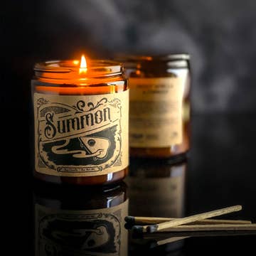 SUMMON Soy Candle | Label Design by Ludlow Luna | Hand-poured in Austin, TX • 8oz Candle in Re-useable Amber Glass Jar • Soy Blend Wax with Cotton Lead-Free Wick • Made with Clean Scents: No Toxins or Phthalates • Total Burn Time: 45+ hours with Proper Care [FULL SCENT PROFILE] Top: Eucalyptus, Mint // Middle: Cypress, Pine // Bottom: Tonka Bean, Smoke PLEASE NOTE: This candle's fragrance is infused with natural essential oils, including fir needle, cedarwood, eucalyptus, patchouli, and cedar leaf.