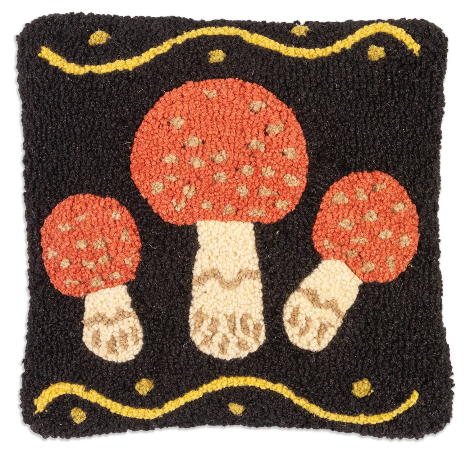 18" x 18" hand hooked pillow, made with 100% natural wool. Zippered velveteen backing with poly-fill pillow insert. Designed in Washington by Julie Paschkis. Handcrafted in India. Member of the Fair Labor Association.Care Instructions-- Do not machine wash or dry clean. - All of our hand-hooked wool products can be gently spot cleaned with a clean soft sponge or cloth using a solution of mild soap and warm water. Wipe up spills as soon as they occur. Blot (don’t rub) with damp sponge or cloth. Rinse and blot excess moisture with a clean, soft towel. Air dry. Do not pull stray loops or threads. - It is normal for a stray loop or end to pop up from time to time. Simply snip off with a scissor.