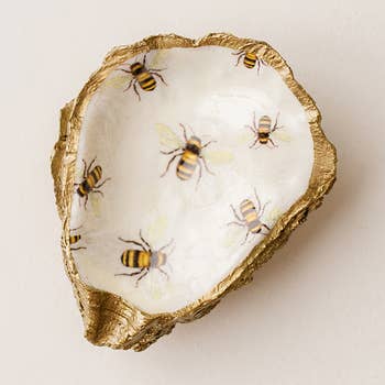 Decoupaged with safari patterned paper, and matte gold finish around the edges, our Murphy Oyster Ring Dish makes the perfect hostess gift, or classic addition to your home! DETAILS: * Approximately 2.2"L x 3.8"W * Decoupaged Patterned Paper * Matte-Gold Finish Due to the nature of the medium, shape and size may vary slightly, as they reflect the natural beauty of oysters.