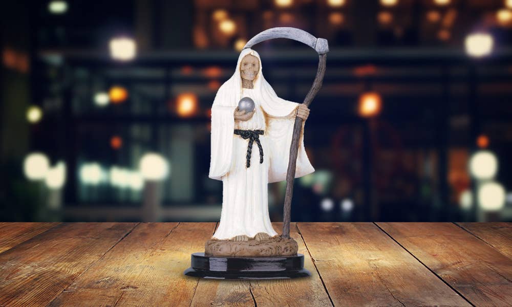 Santa Muerte - Gold. The color gold is assicated with prosperity, abundance, and financial sucess. Devotees may turn to the gold Santa Muerte when seeking wealth or favorable outcomes in financial matters. Product Size: 4.5" x 3.75" x 10.5" Material: Cold Cast Resin Case Pack: 6