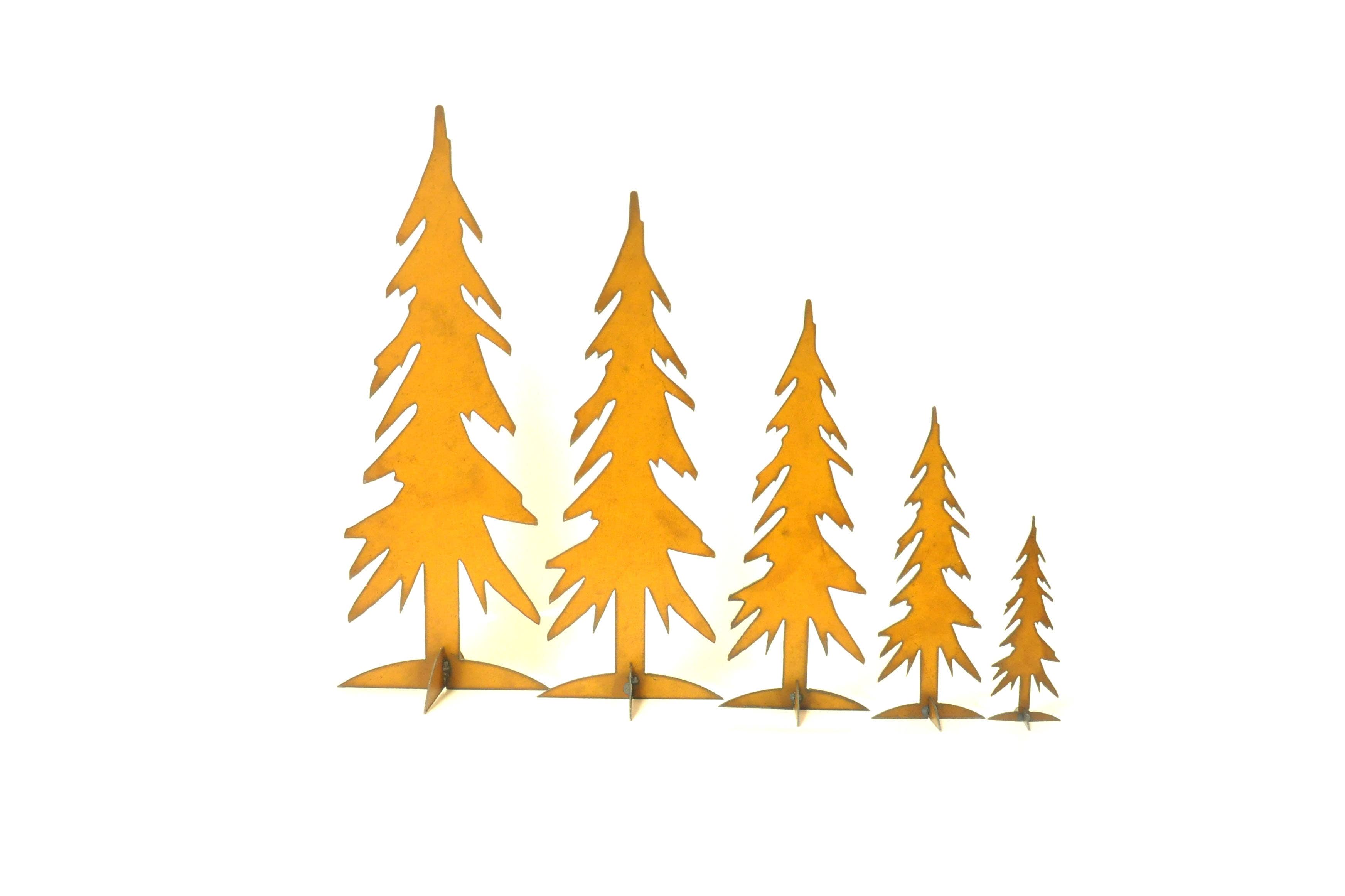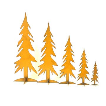 Trees - Set of 3 are charming decorative pieces perfect for your home or garden. This set includes three tree designs: a Large Pine, a Medium Fir, and a Small Spruce. They are made of metal with a rustic, rusty patina finish, adding a vintage touch to your space. These art pieces can be used individually or together to create your own personalized displays. Whether indoors or outdoors, these Trees will add a touch of natural beauty to any setting, making them an excellent addition to your indoor or outdoor living space. Large Pine: 15" x 4.5" Birch stumps not included Medium Fir: 12" x 3.5" Small Spruce: 8.7" x 2.5"