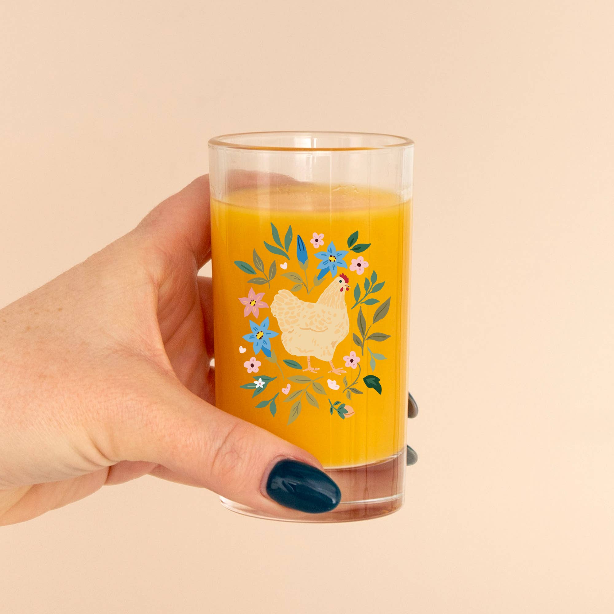 Bring a touch of rustic charm to your table with our Sussex Chicken Folk Floral Mini Juice Glass. Adorned with a delightful folk floral design that celebrates the spirit of farmhouse living. Ideal for serving refreshing juices, smoothies, or even as a charming way to present appetizers, these mini glasses are versatile for any occasion. An ideal gift for friends and family who cherish the joys of farm life, gardening, or home entertaining. Perfect for birthdays, housewarmings, or simply to show you care! Title | Sussex Chicken Folk Floral Mini Juice Glass Features | Hand-painted design printed on glass Size | 6.09 oz Care Instructions | Hand wash only