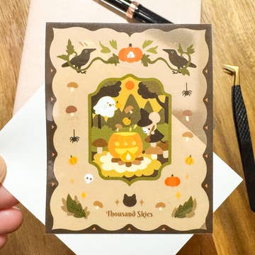 Celebrate the cozy magic of autumn with this earthy sticker sheet, featuring warm oranges, golds, reds, and greens. Shoppers will love the mix of whimsical fall and Halloween artwork, featuring a pumpkin beetle, a black cat on a jack-o'-lantern, a candy corn moth, a teapot house, and more. With designs ranging from apple pie to pumpkin spice latte, this sheet blends harvest warmth and spooky-cute charm, making it a versatile seasonal impulse buy. Perfect for decorating journals, laptops, water bottles, or fall gift bags, it’s a must-have for shops catering to autumn lovers. -5x7” Laminated Vinyl Sticker Sheet -Includes 11 fall & Halloween-inspired stickers (1.5–2” each) -Earthy autumn palette: oranges, golds, reds, and greens -Waterproof, durable, and hand-laminated -Printed locally in Camp Hill, PA -Designed, cut, and packaged in Eve’s Carlisle, PA studio -Original artwork by Eve Tiday Ideal for bookstores, gift shops, and stationery retailers looking to boost seasonal sales with cozy fall charm and whimsical Halloween appeal.