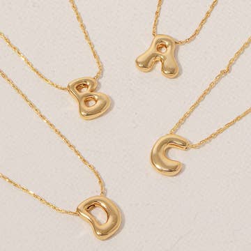 This classic and timeless letter necklace features a dainty chain and an bubble balloon style initial. Effortlessly chic and dainty and will look great on puff hem dress. DIMENSION length: 16" Charm size: .5" x.35" ext: 3" ext clasp: Lobster Claw Metal finish: Gold Plating product: Lead & Nickel Compliant Ant-tarnish: Double E-coating