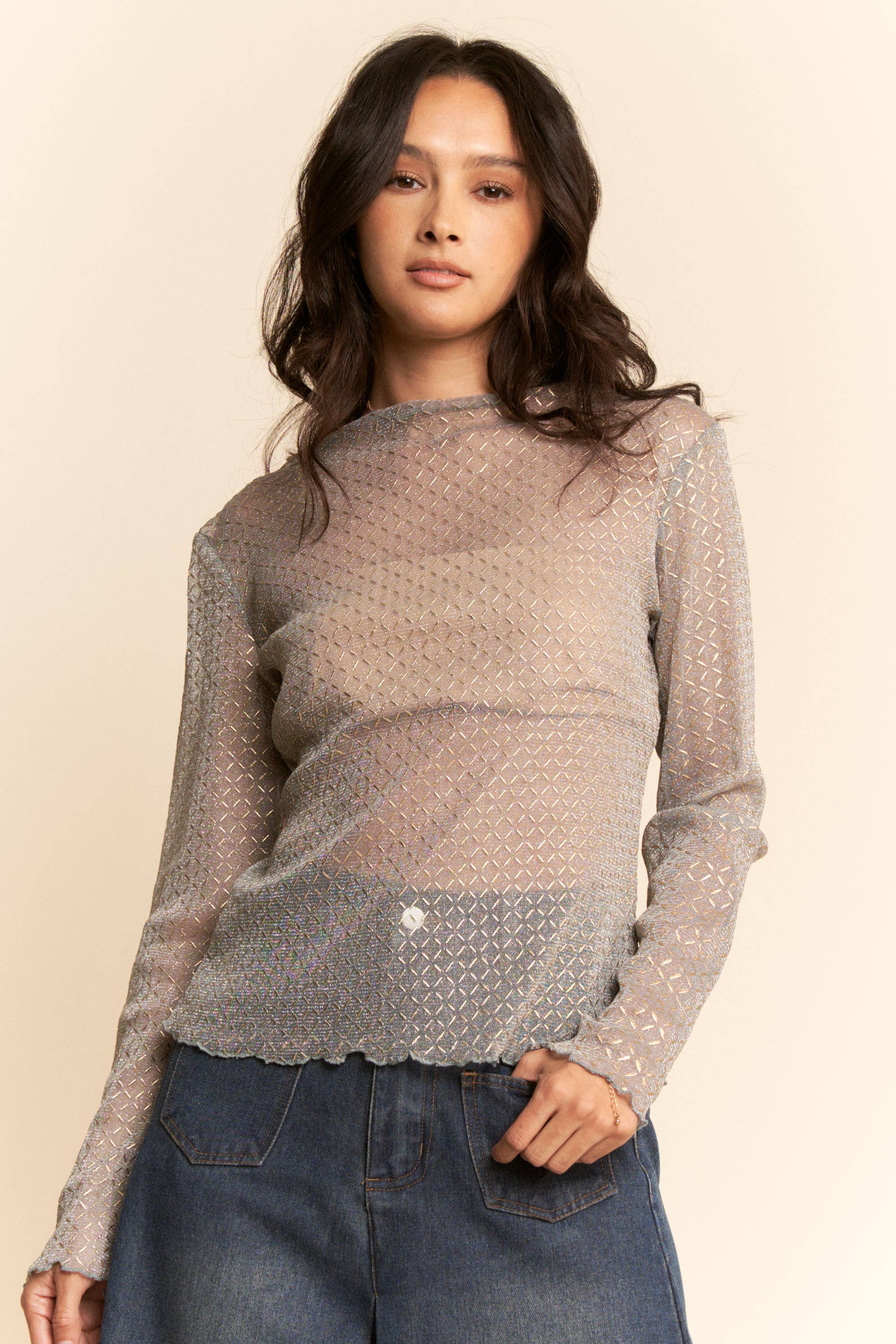 Crochet cover-up top with round neck, drop shoulders, and long bell sleeves. Features: regular size, standard, young contemporary, contemporary, crochet, top, long sleeve, knit, round neck, drop shoulder, bell sleeves, trendy, stylish, fashionable, daily wear, everyday wear, Spring, Summer, S/S, women's clothing, women's apparel, women's wear