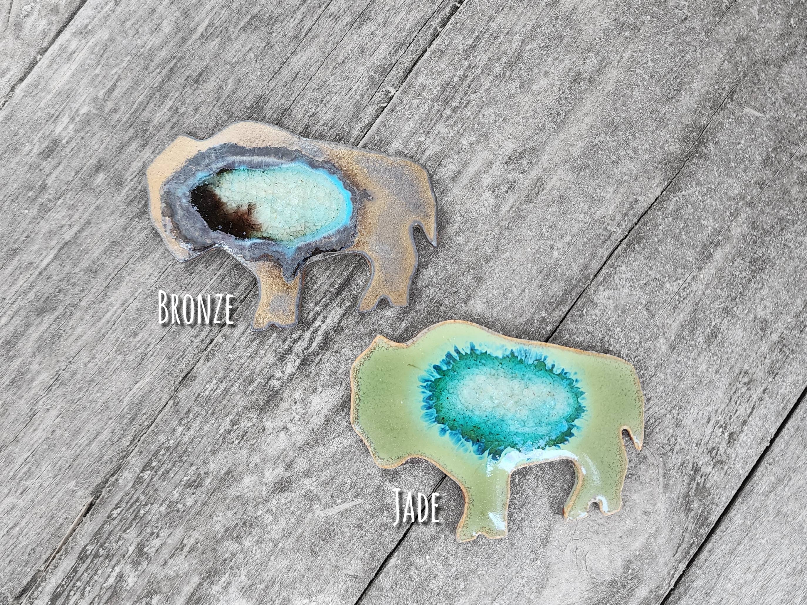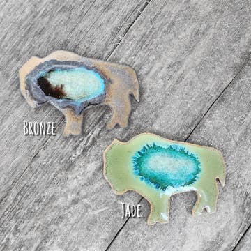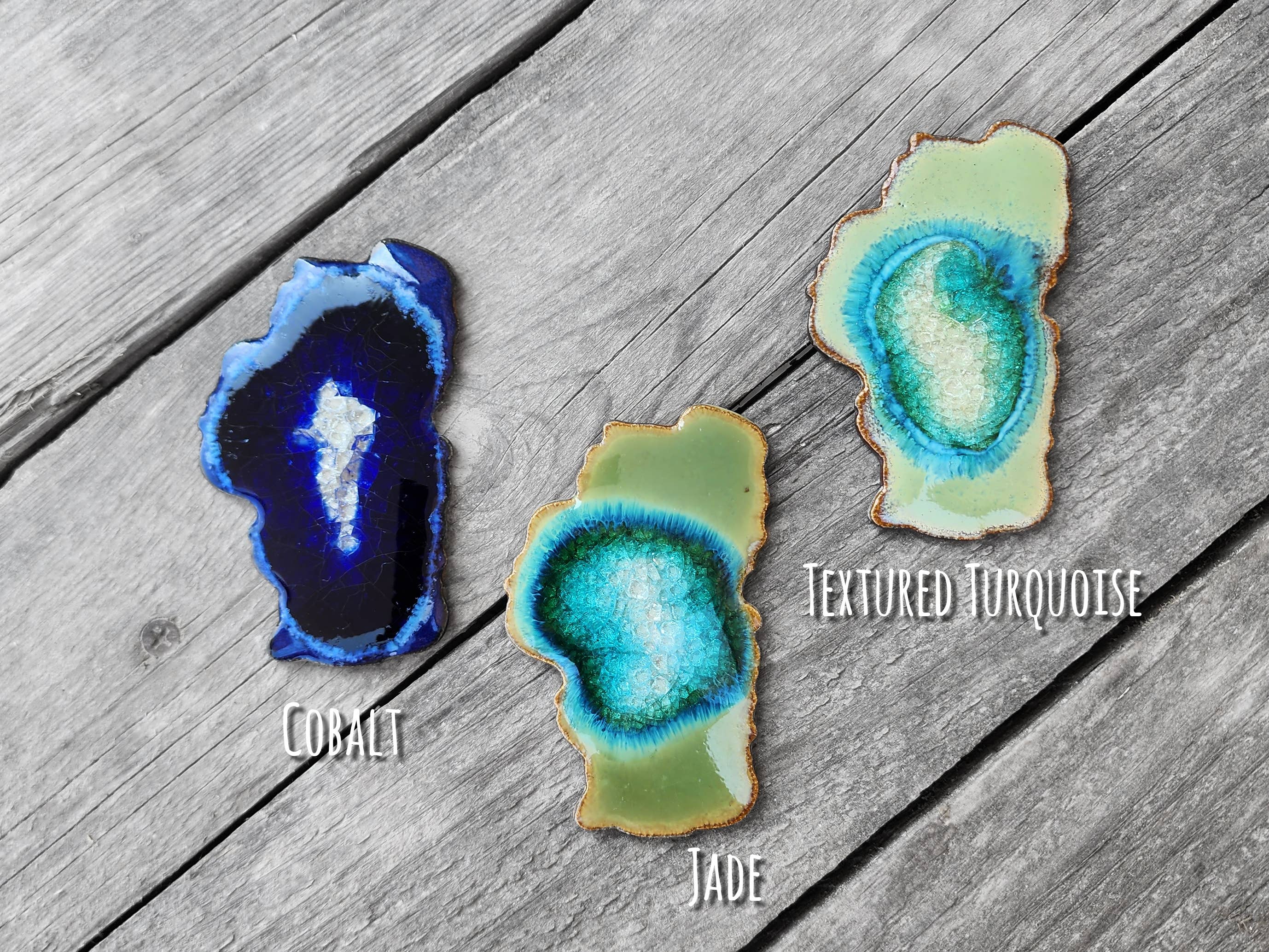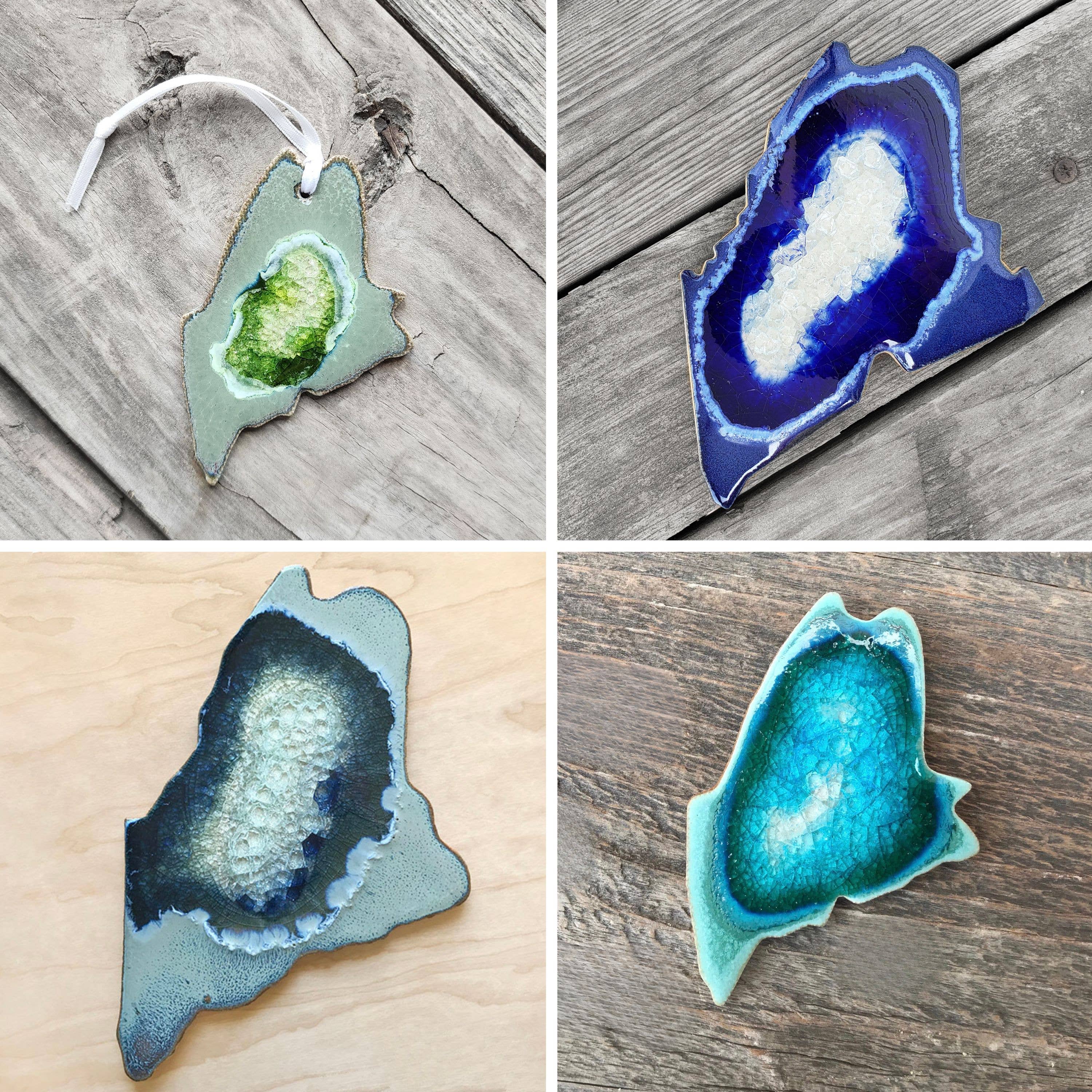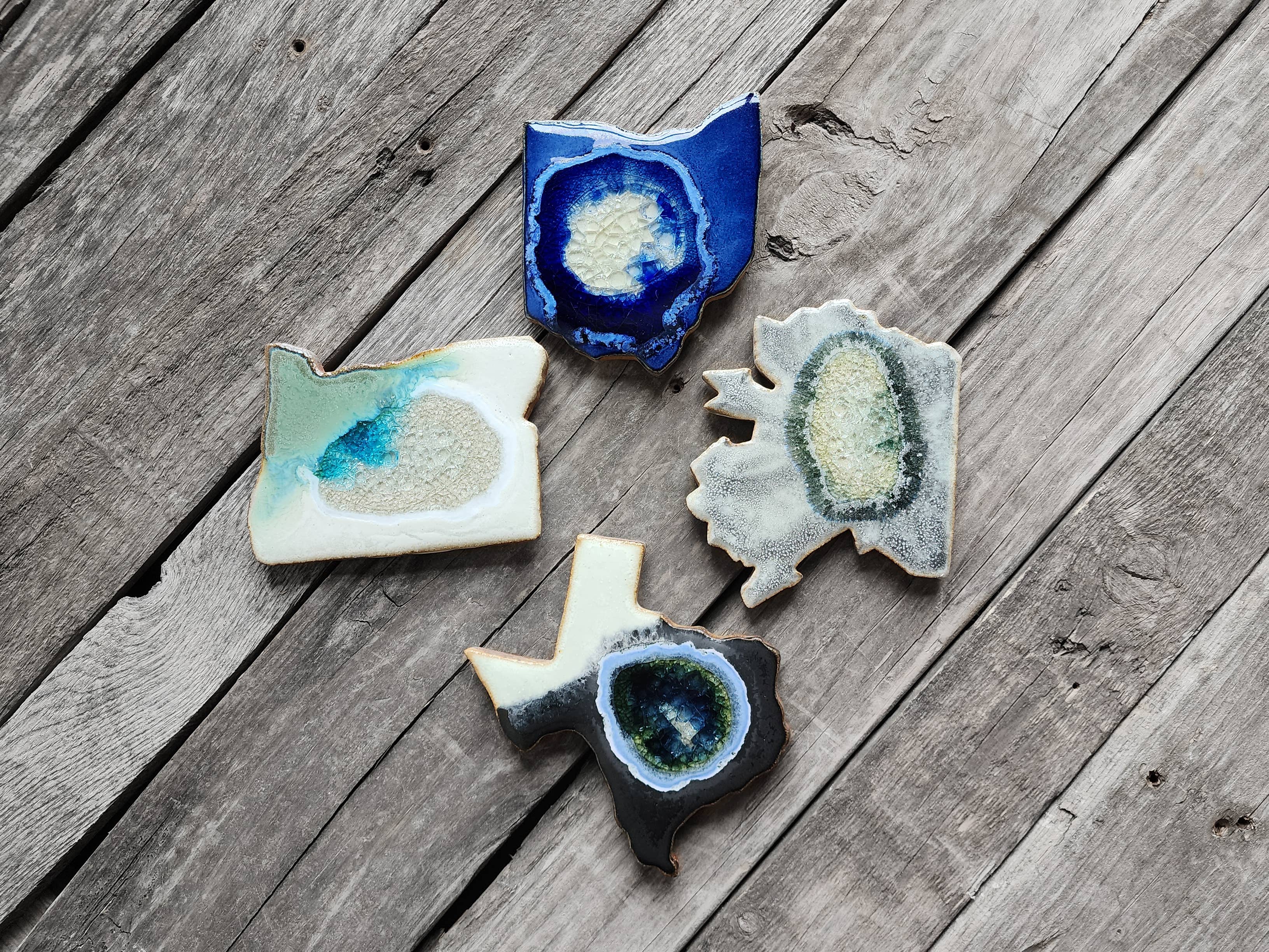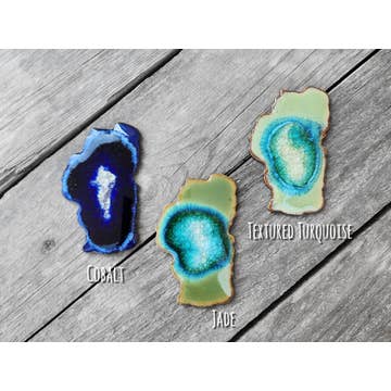 Celebrate your state pride with this handmade ceramic state magnet, crafted with care by Kerry Brooks’s team of artists at Dock 6 Pottery in Minneapolis. With a perfect blend of rustic charm and modern style, our "geode" magnets are handmade from clay and glass to resemble slices of geodes! Each magnet is handcrafted from high-quality clay, showcasing the shape in intricate detail. Featuring a state map outline, this magnet makes a thoughtful home state souvenir, or a meaningful and unique gift for anyone looking to honor their roots. Perfect as a housewarming gift or custom keepsake, this refrigerator magnet will be a timeless addition to your kitchen. Whether you're decorating for the season or giving a personalized touch to your home, this magnet is sure to delight. Sizes vary but most magnets are about 3 inches long x 2 inches wide. Message us for specific measurement California, New York, Texas, Florida, Hawaii, Nevada, Illinois, Minnesota, Washington, Colorado, Arizona