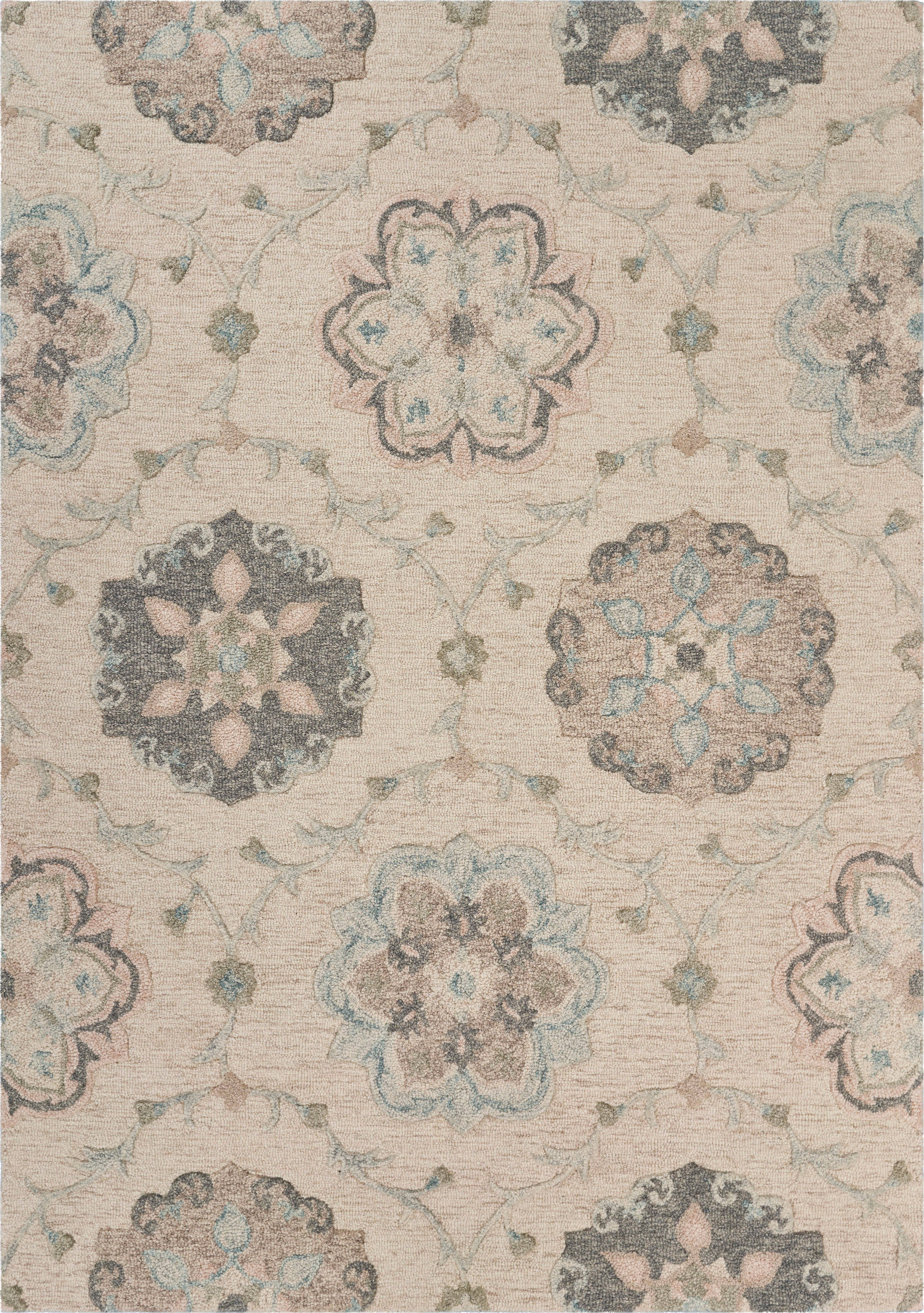 "Benefits: - Hand-hooked in India by expert artisans - Crafted using 100% premium, all-natural wool in a cut and micro-looped fashion - Suits traditional, transitional, casual, modern farmhouse, coastal, classic, vintage, bohemian, and cottage decor styles - Medium pile height, giving a plush feel underfoot - Constructed with a thick cotton backing, limiting shifting and sliding Featuring a classic medallion design hand-tufted onto a multi-colored, textured ground, this gorgeous area rug will fit perfectly in a bedroom, nursery, living room, dining room, home office, playroom, or kitchen. Our area rugs are handmade in India using 100% all-natural wool in a cut-and-looped pile construction and stabilized with a cotton backing. Versatile and beautiful, it's the ultimate statement piece for your lovely home. * Update your home for fall and the holidays * perfect Christmas holiday gift, Mother's Day gift, or Thanksgiving gathering home decor updates * Pottery Barn style rug *"