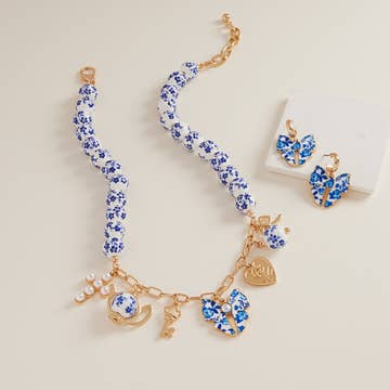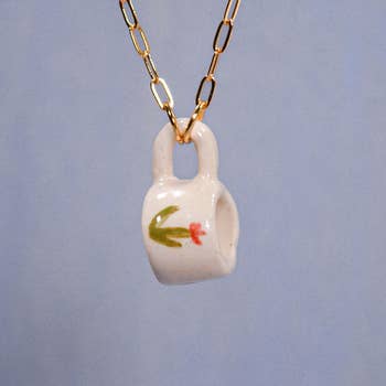 Enjoy this fashionable teatime treasure necklace. A charming gold chain graced with a ceramic pendant shaped like a tea cup, featuring classic blue and white designs. This delightful piece brews a blend of whimsy and elegance, perfect for those who savor life's cozy moments. * Made in China * Vintage inspired tea cup necklace * Genuine ceramic tea cup pendant * Measures: 15 1/2 x 18" long; 5/8 x 1/2" pendant * Materials: Gold Tone Metal, Ceramic * Closure: Lobster Clasp