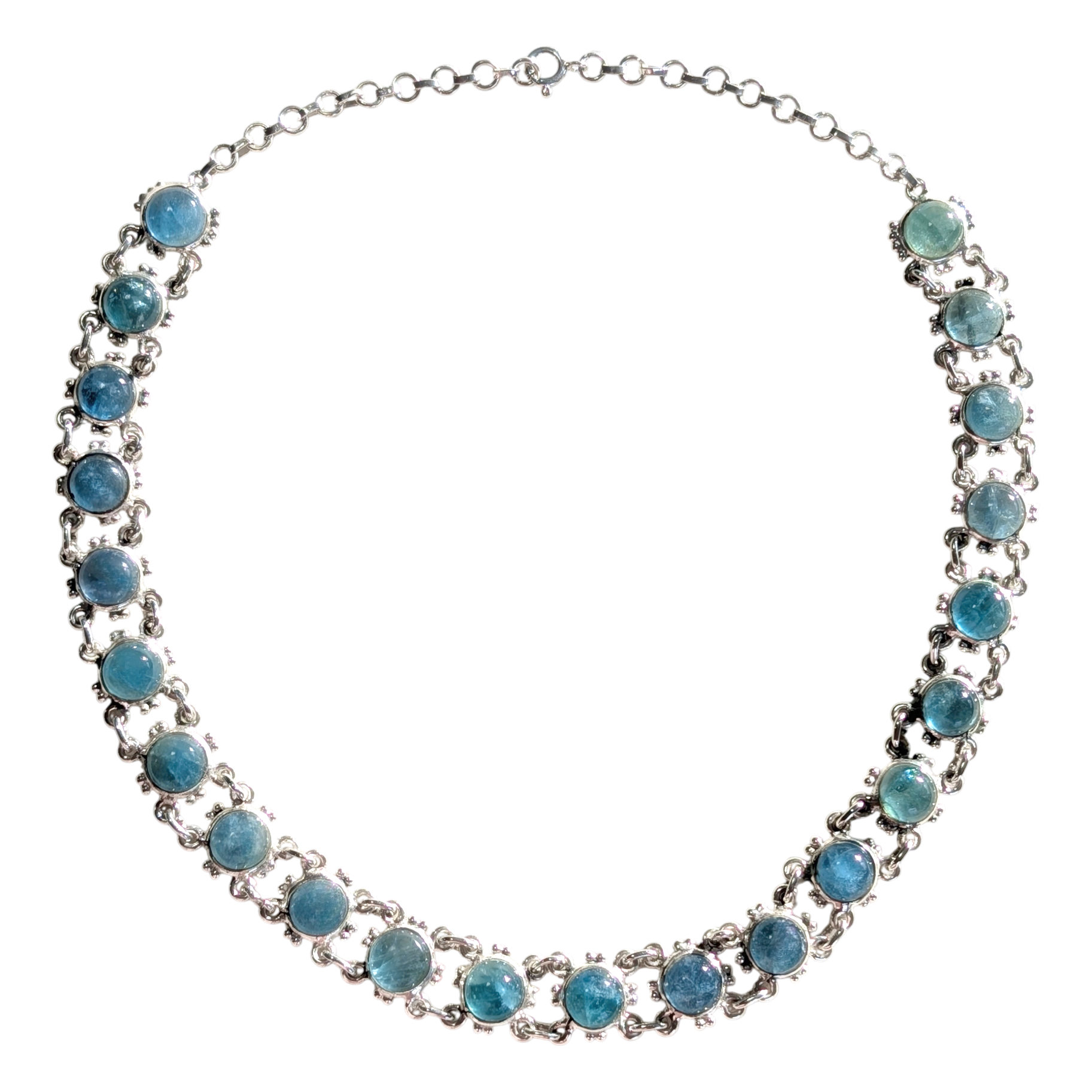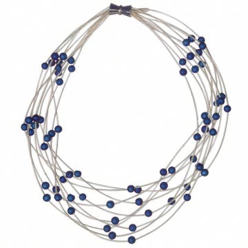 Blue and Silver Resin colors with a Tiger tail coated wire. 18 inches with a extended chain. Rhodium material good for sensitive skin.