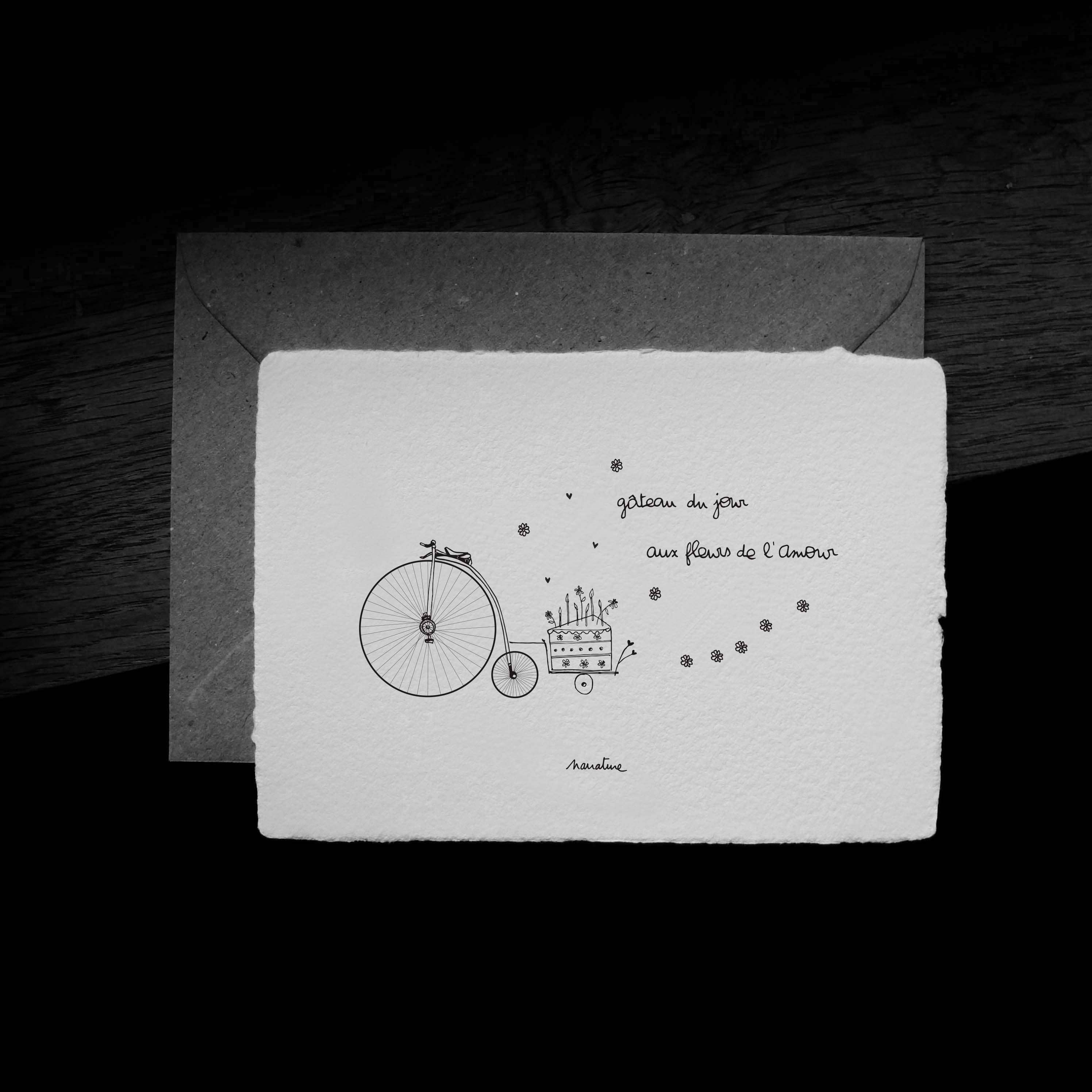 Card sold with a recycled kraft envelope in a transparent protective bag and with a brand explanation label. Handcrafted manufacturing and printing. > Handmade paper made from vegetable fibers of flax, hemp and cotton recycled by a passionate paper maker working in a mill in my region. The cards are then printed by me in my workshop in Corrèze. The paper is left raw and without lamination after printing at the mill. The poems and illustrations are thought out and drawn in my studio in Corrèze. Texts & illustrations: ©Narrature