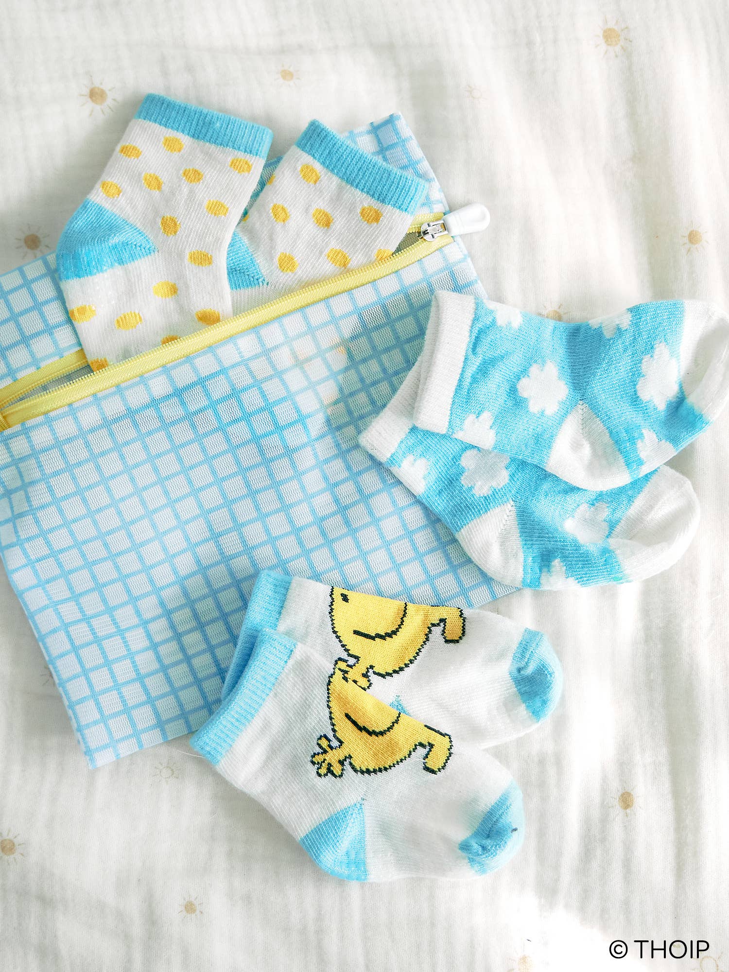 Step into a world of comfort with the Baby Socks Trio by JuJuBe × Studio Oh! For babies 3 to 12 months old, these socks sets have three adorable, coordinating designs and include non-slip gripper soles for Baby's safety. Find the iconic Little Miss Sunshine character from Mr. Men Little Miss™, plus sweet flowers and polka dots for versatile styling. Each trio comes with a mesh wash bag so you will never lose a tiny sock in the wash! Soft, durable, and super cute, these socks look precious on baby feet! The Baby Socks Trio sets make great gifts for new parents or moms-to-be. This product is manufactured by Orange Circle Studio, under license from MR. MEN™ LITTLE MISS™ © 2024 THOIP (a SANRIO Company). All rights reserved. Socks: 90% polyester, 5% spandex, 5% PVC; zippered wash bag: 100% polyester Machine washable; includes mesh wash bag to prevent damage and lost socks *By purchasing this item, you agree to honor the MAP policy which is double wholesale cost.