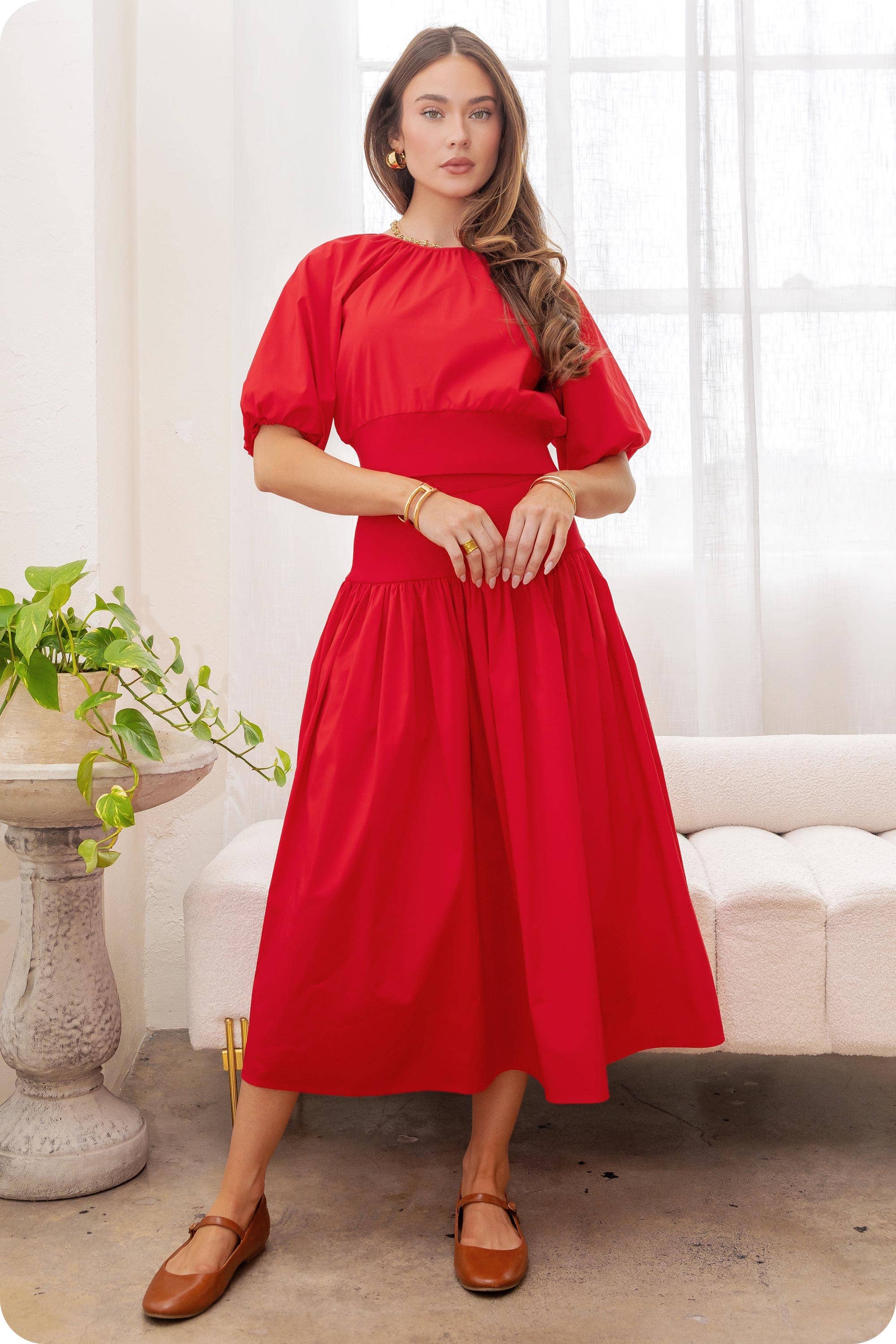 This stylish summer outfit features a chic red camisole with wide straps and gold button details paired with a matching A-line skirt. The set combines comfort and fashion, perfect for casual outings or semi-formal occasions. The A-line skirt's pleated design offers a flattering fit, while the high-quality fabric ensures durability. This versatile set can be dressed up or down, making it an essential addition to any wardrobe. Ideal for pairing with sandals, heels, or sneakers.