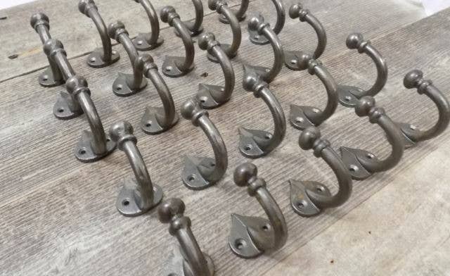 Edwardian /victorian style iron hook. Measures approximately 4 3/4" tall from top to bottom and 4" out from the wall. Use together or separately as towel hook, coat hook, hat hook. Etc.