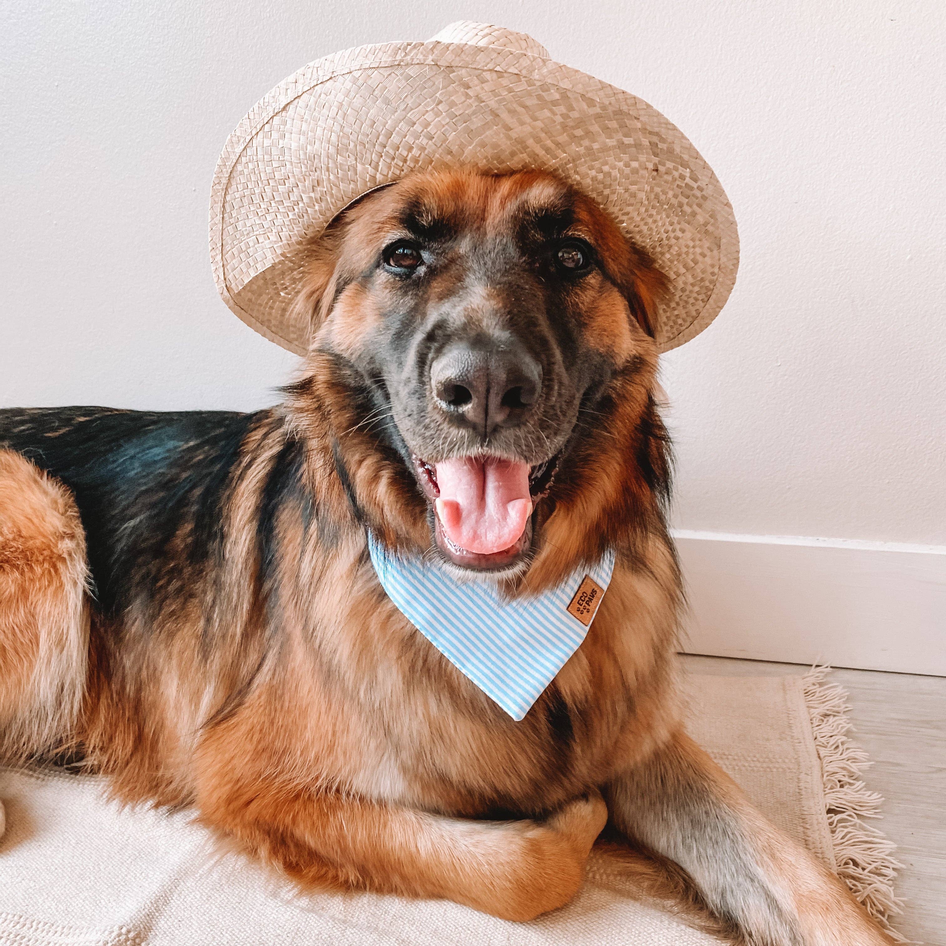 The writing is vinyl. Each bandana is individually handmade with love in Montreal, Canada. Made from cotton fabric, organic cotton thread, and our custom 'ECO4PAWS' vegan leather labels. Our fabric is printed using water-based, ecologically safe pigment inks. Our bandana snaps on at the neck for a secure and comfortable fit. All bandanas have a set of 2 snaps so you can find your perfect fit. They can be folded to your preferred length, perfect for short-legged fur babies. Size Guide XS - Neck up to 12" S - Neck up to 14" M - Neck up to 16" L - Neck up to 20" XL - Neck up to 24" Please note: Due to the handmade nature of each bandana, sizes may differ slightly. Care Please hand wash or spot clean only to help your bandana last longer. Iron the reverse side of the fabric when required, avoiding the label. We recommend removing your bandana prior to muddy or rough play dates. Please always monitor your pet when they wear their bandana.