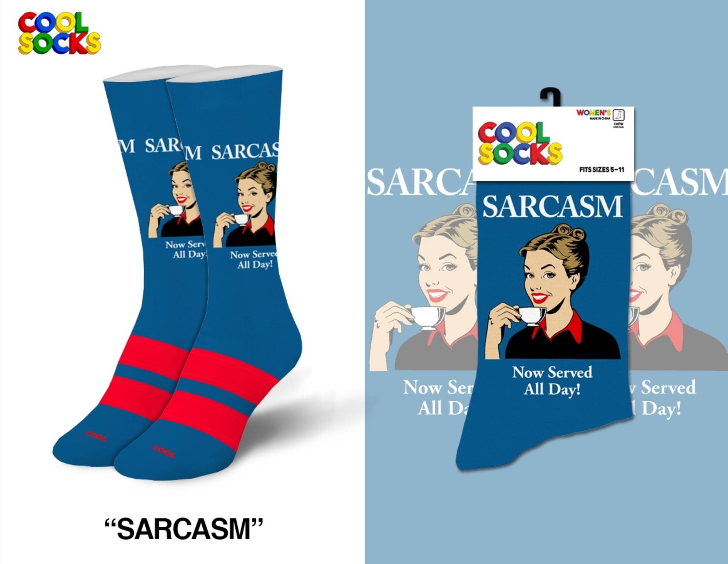 Women's crew socks with saying "Dripping With Sarcasm" Stylish and comfortable. Yet with a spicy attitude! Fits ladies' shoe size 5 to 10. 80% Cotton, 15% Nylon, 5% Spandex. Easy Care - Machine Wash. Item # SK0173