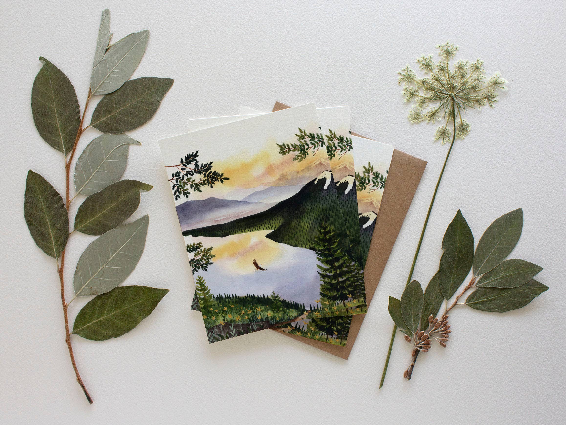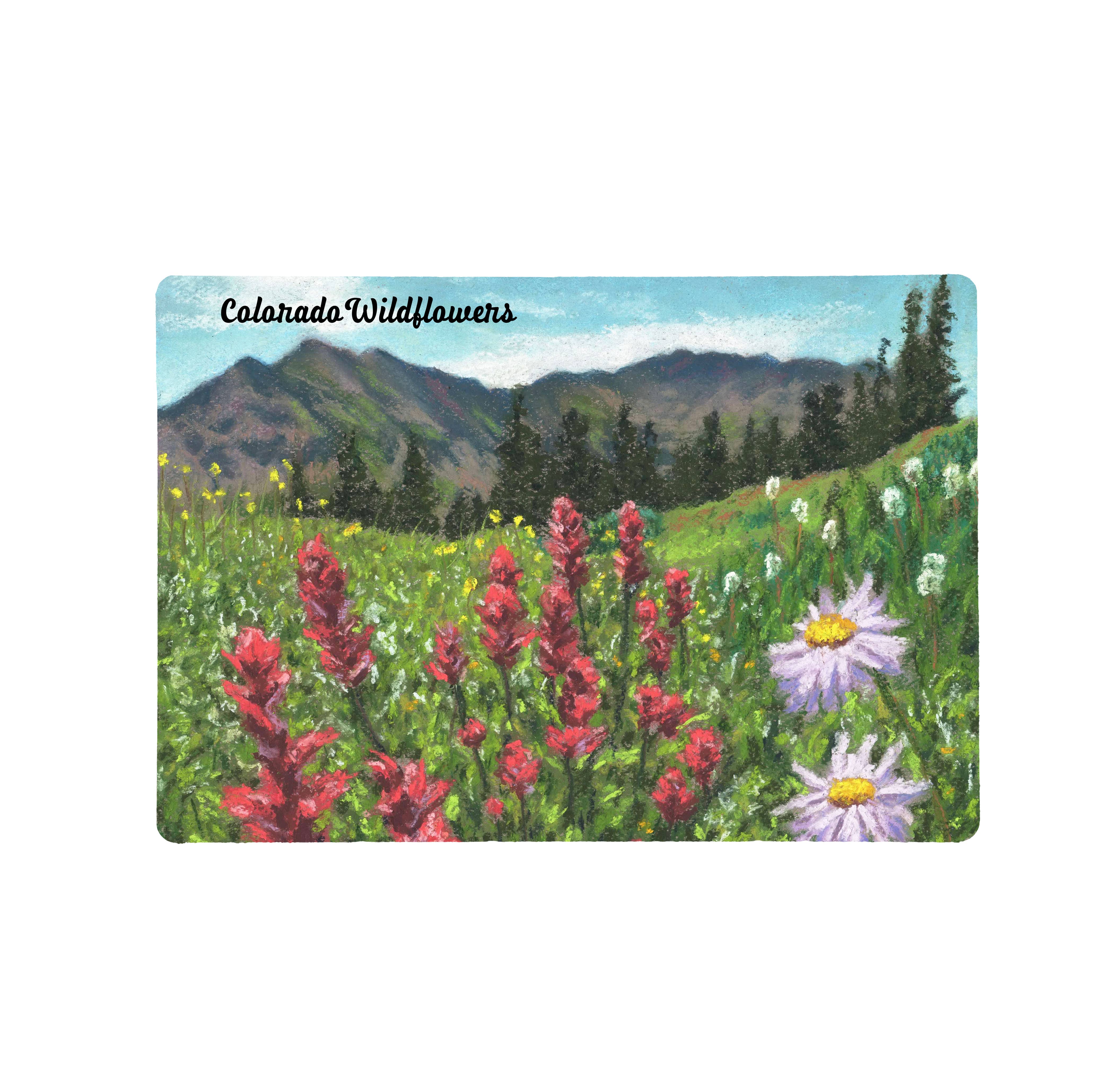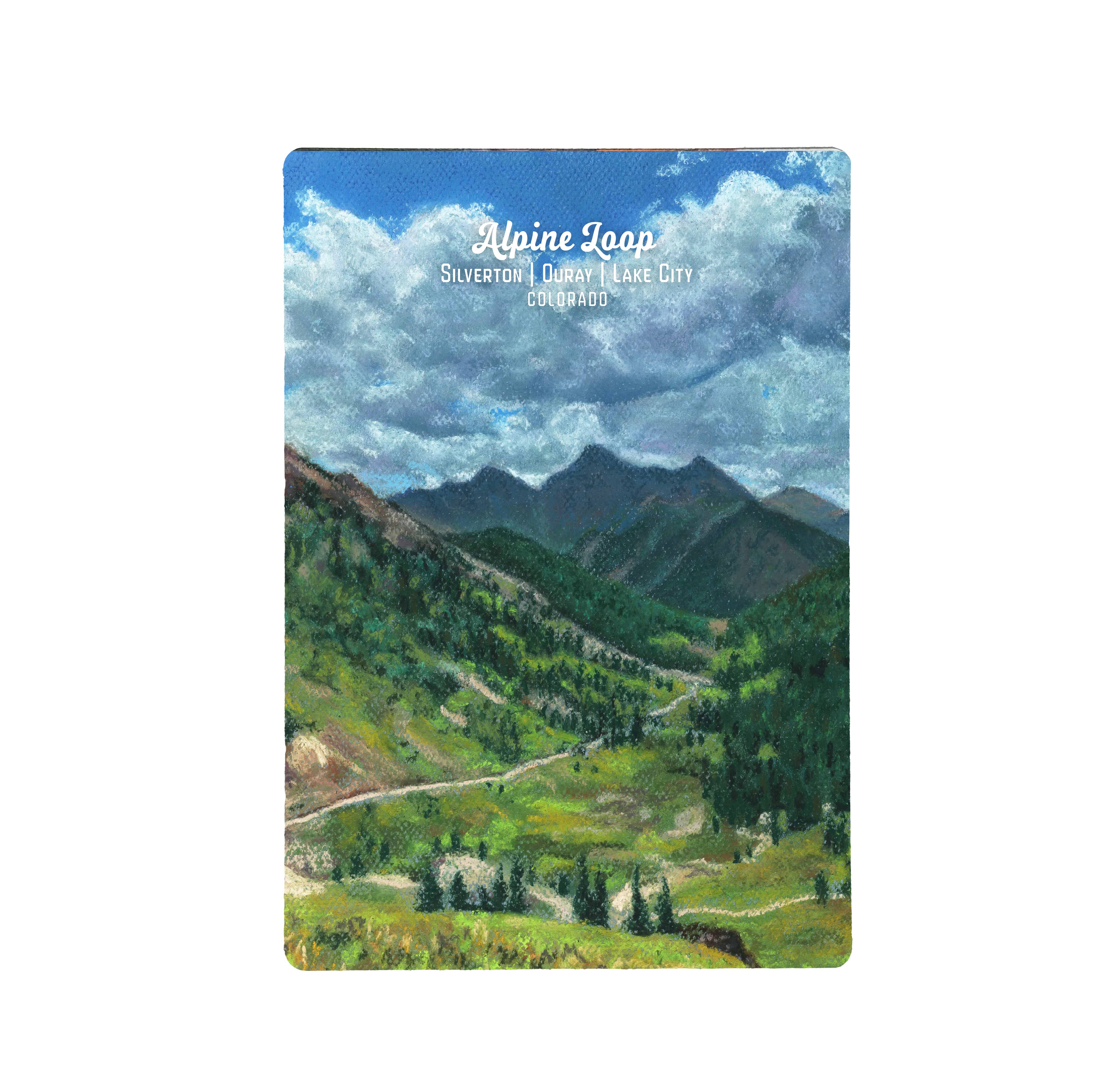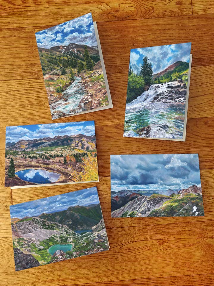 Set of five blank note cards 4¼” x 6” featuring paintings by Duck Girl Art of Silverton, Colorado in the San Juan Mountains landscapes, including Little Molas Lake, Ice Lakes, Lake Como, Mineral Creek, and aspen trees at Coal Bank Pass. Envelopes included. Packaged in clear plastic sleeve with thumbnail of images on the back.