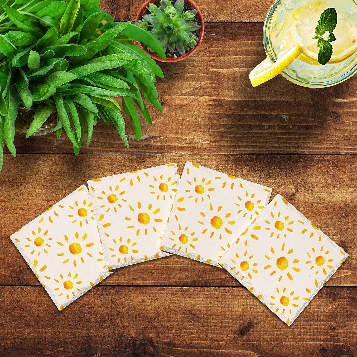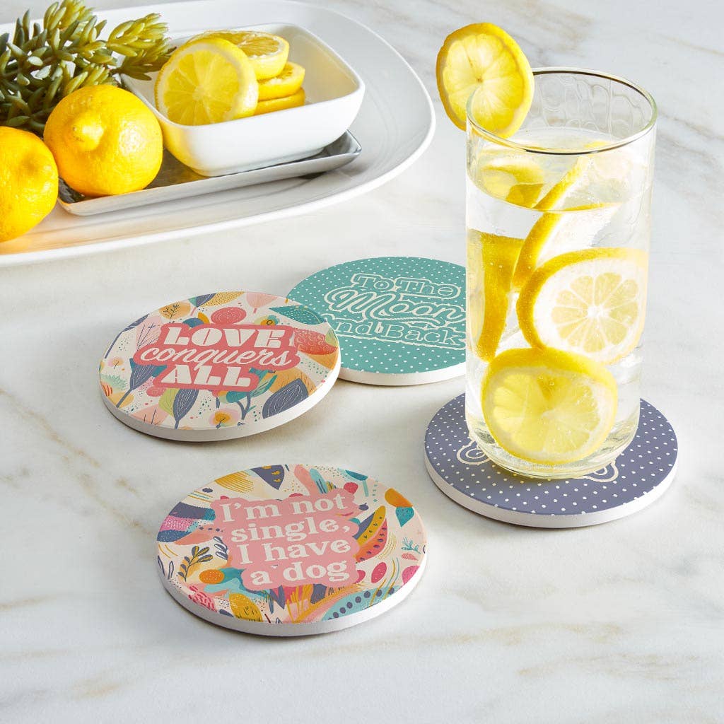 These fun and colorful coasters bring a pop of color to your home and interior decor. Featuring yellow and orange wavy line stripes, they are absorbent and good for hundreds of uses. They measure 3.7" diameter and are made with the paper shavings saved from sustainable foresting, so they are eco-friendly and chic. They are a perfect compliment to an at home bar alongside your favorite cocktail, saving your surface from sweating drinks and they make a great party favor too. The stripes have a whimsical, beach inspired vibe that evokes summer, sun and being poolside next to water on a European vacation, but they are great for year round design appeal. Bold and graphic this coaster set makes a great housewarming and hostess gift too.