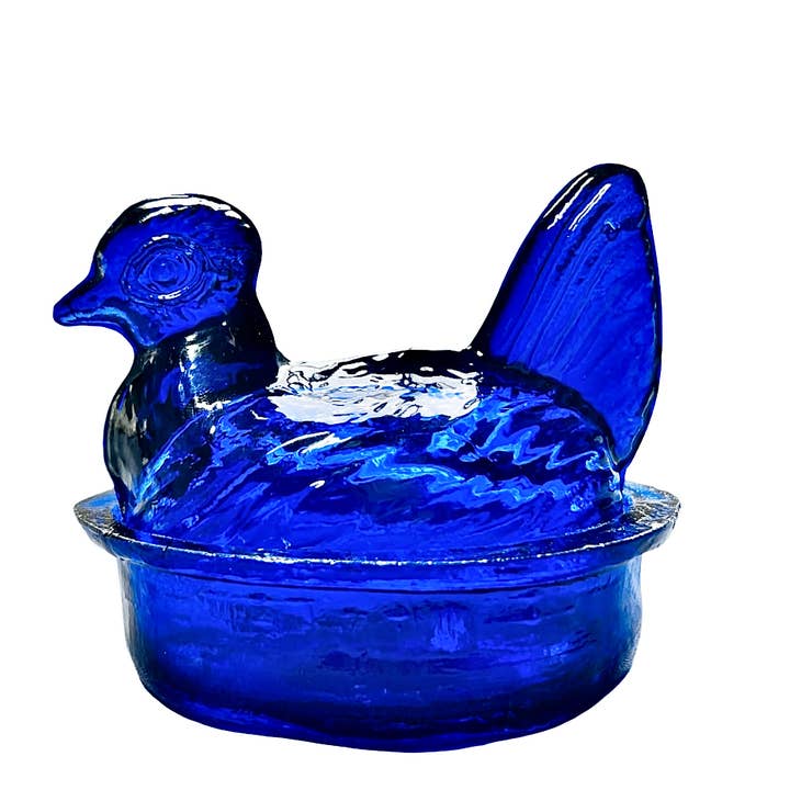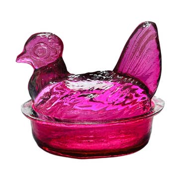 Beautiful & Functional Glass Nesting Hens With Lid. Hand Blown By Artisans In Colombia Using Recycled Glass. Ideal for holding spices on your kitchen counter or tabletop, safekeeping your rings on your armoire or just as a collectors item. These adorable chickens are sustainably made with hand blown recycled glass. Our artisans transform recycled glass into a wide variety of beautiful translucent and decorated figures, employing cleaner production alternatives in their manufacturing process, which help contribute to a healthy environment for the community. Dimensions: Approx. 3in Long x 2in Wide x 3.5in Height (7.6 cm x 5.0 cm x 8.7 cm) Material: Recycled Glass (Flash Painted) Handmade With Love in Colombia - Fair Trade *DUE TO THE HANDMADE NATURE OF OUR HENS SOME BUBBLES AND WAVY EDGES WILL BE PRESENT FROM THE HANDBLOWN GLASS PROCESS.