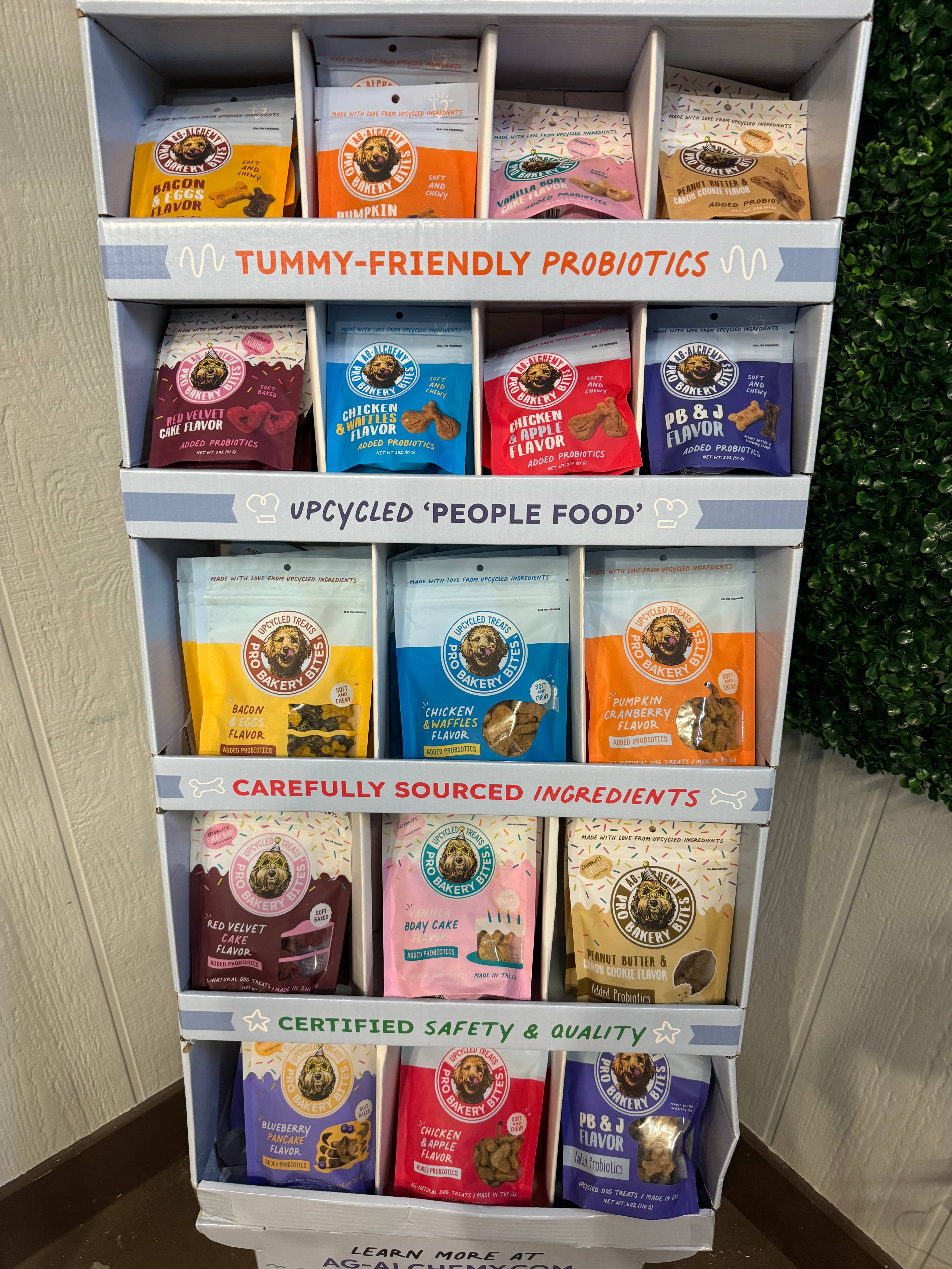 FULLY STOCKED Cardboard Floor Display 7 - 2oz Bacon & Eggs / 7 - 2oz Chicken & Apple 7 - 2oz Chicken & Waffles / 7 - 2oz PB&J 7 - 2oz Pumpkin Cranberry / 7 - 2oz Vanilla Bday Cake 7 - 2oz Peanut Butter Carob Cookie / 7 - 2oz Red Velvet Cake 4 - 6oz Vanilla Bday Cake / 4 - 6oz Peanut Butter Carob Cookie 4 - 6oz Red Velvet Cake / 4 - 6oz Bacon & Eggs 4 - 6oz Chicken & Apple / 4 - 6oz Chicken & Waffles 4 - 6oz PB&J / 4 - 6oz Pumpkin Cranberry 4 - 6oz Superfoodie