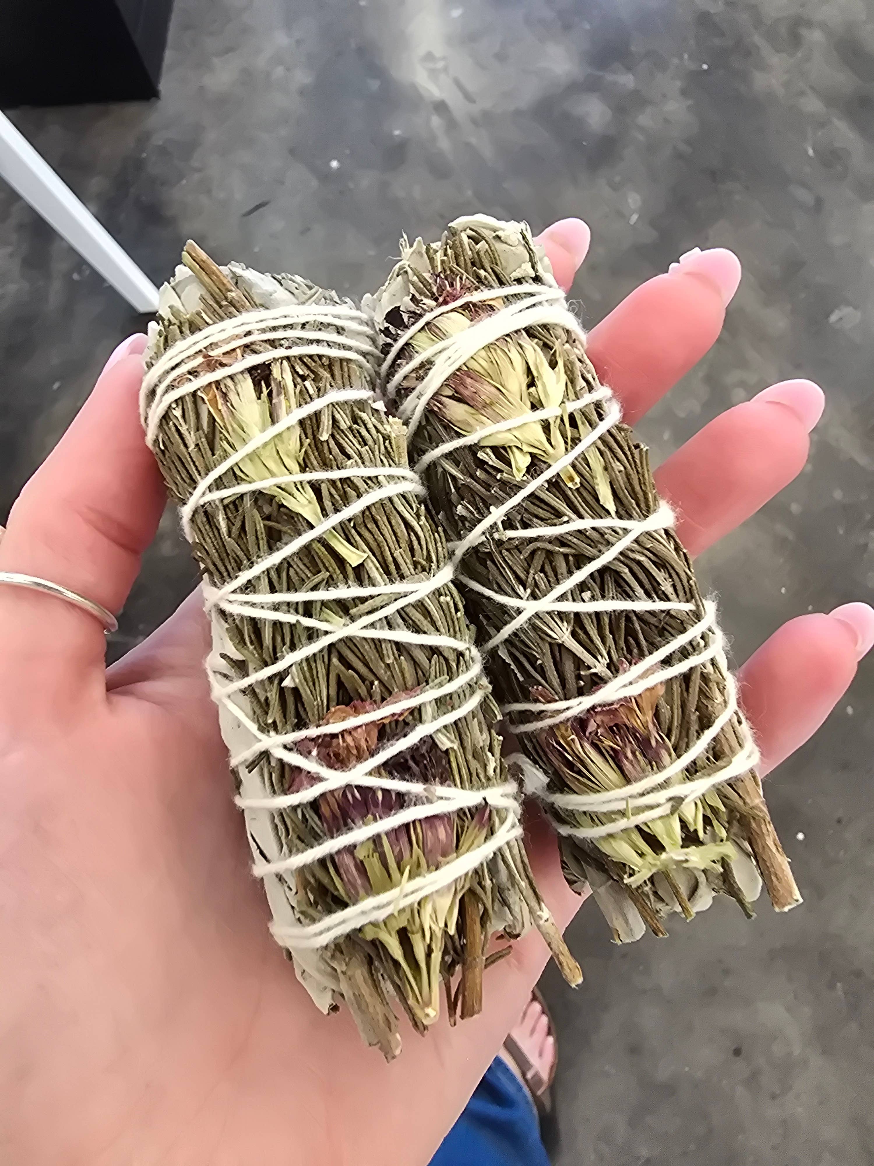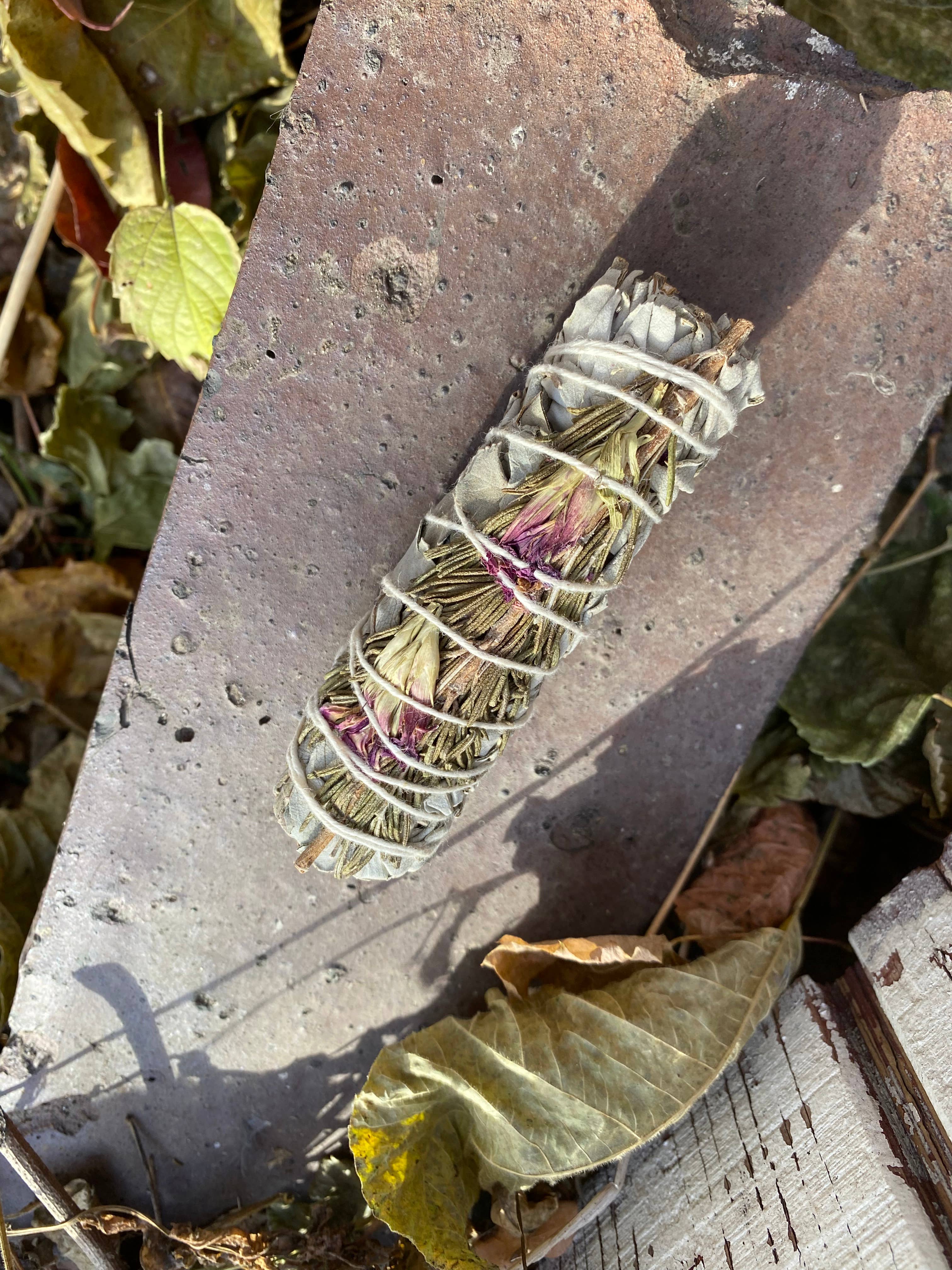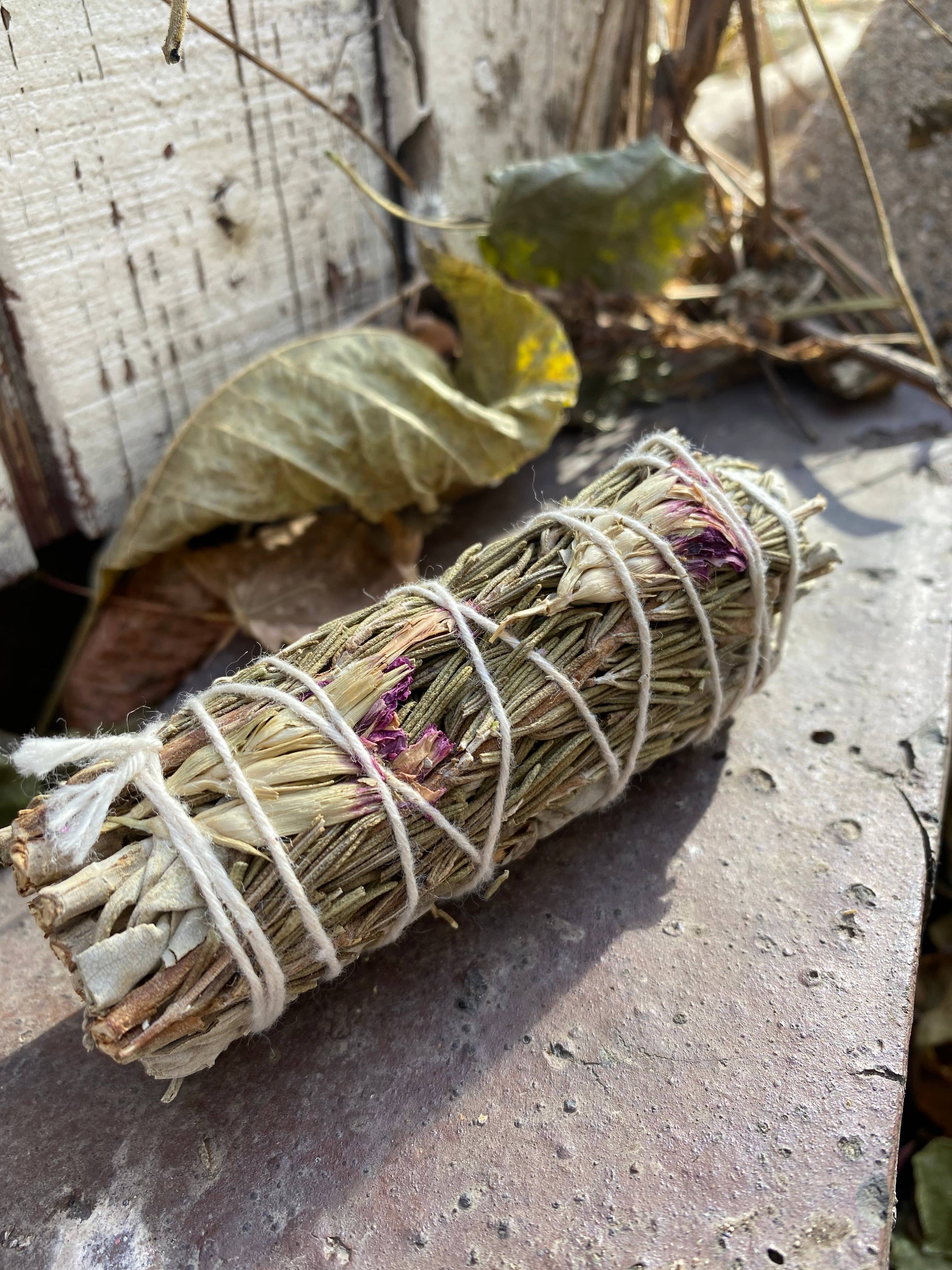4" Organic White Sage Mixed with a Variety of Flowers. ORGANIC: Sourced responsibly in California, white sage (Salvia Apiana) is proven to neutralize negative energy, kill harmful bacteria, improve sleep, alleviate anxiety and stress. When burned the smoke heals and brings one back into balance and cleanses the body and mind of negative spirits and impurities. Smudging sage has also been known globally to help relieve worry, open the mind, clear negative thoughts and feelings, and de-stress the spirit. TAKE PART IN A SACRED TRADITION: Sage is a traditional medicine plant of the Indigenous peoples, used for healing and ceremony. It is used for cleansing and purification, and to open people up to a greater connection with the sacred. It is thought to banish negative energy, not only on the physical level, but also emotionally, mentally and spiritually. It has a very aromatic, sharp and stimulating smell, and its action works on all the senses.