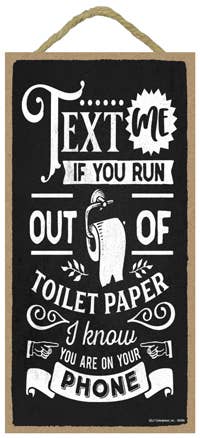Text Me If You Run Out Of TP I Know You're On Your Phone Funny Bathroom Sign. All our signs are build into a wooden box frame with a rustic touch. Signs are hung directly off the frame or will stand up right on a table or shelf.