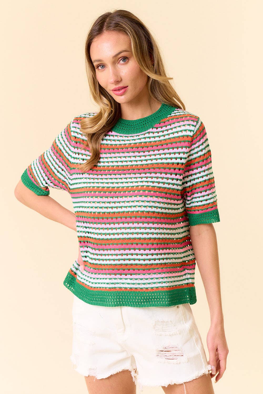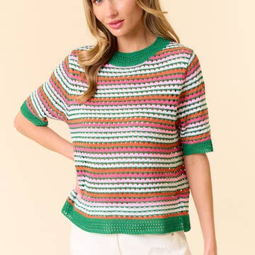 Level up your everyday look by pairing this wavy stripe sweater top with your favorite bottoms! Cozy knit shapes this stylish sweater top with a round neckline, flutter sleeves, and a relaxed waist-length bodice. Wavy stripes with pointelle adds a trendy detail. + Wavy stripes flutter sleeve sweater top + Ribbed crew neckline + Ribbed short flutter sleeves + Wavy stripes with pointelle + Waist-length fit + Model is 5' 10.5” 32-24-36 and wears a S