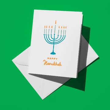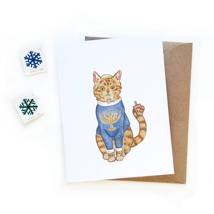 Celebrate the season with a playful twist! This card features a silly orange cat rocking a tacky Hanukkah sweater and a goofy Hanukkiah hat, perfect for spreading festive cheer and smiles. Ideal for anyone who loves a bit of holiday humor and feline fun. L'chaim! Featuring original watercolor illustrations and hand-lettering. The illustrations carry over to the back of the card, as well. * Card measures 4.25" x 5.5" (A2) card and is blank inside * Includes one Kraft envelope * Card and envelope come wrapped in a cellophane sleeve