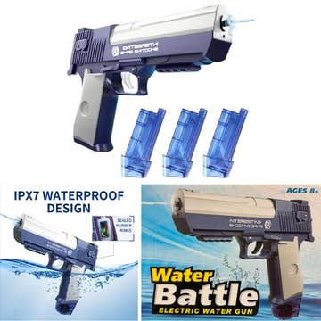 Electric Automatic Blaster Emission Squirt Water Gun -4 x AA Batteries Required (NOT Included) -Water Capacity: 450 ml -Gun Dimensions: 12.25" * 7.75" * 2.5" -Packaging Dimensions: 12.75" * 10" * 2.5" (Individually packed and sealed) -Assorted Color (4 - Random Assortments Per Color) -Features Automatic emission with blue LED Light. Waterproof (IPX7) rating -100% Plastic -CA Prop 65 Advisory -DISCLAIMER: Suitable for ages 3+. Although items such as these are NOT heavy they are bulky taking up space, thus reflected in shipping cost.