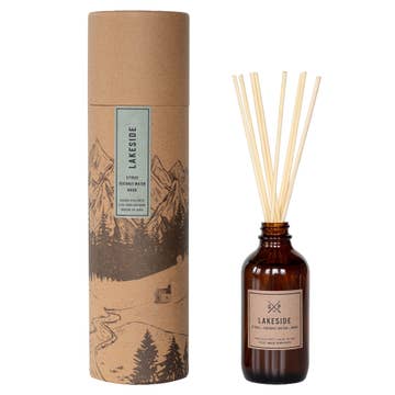 Feel serene and connected to the wilderness with fragrances inspired by the great trees and the wondrous outdoors. This collection is for the adventure seekers! Lakeside features a fresh aquatic blend of ozonic sweetness, citrus, vanilla, geranium and coconut water. -Diffuser comes in a 4 oz. amber glass bottle with eight natural reeds measuring 8.5". Packaged in a kraft tube with mountain print. -Reed oil will last at least 3 months. -Vegan, free of phthalates and parabens, and cruelty-free. -Poured and packaged with love in Pennsylvania, USA.