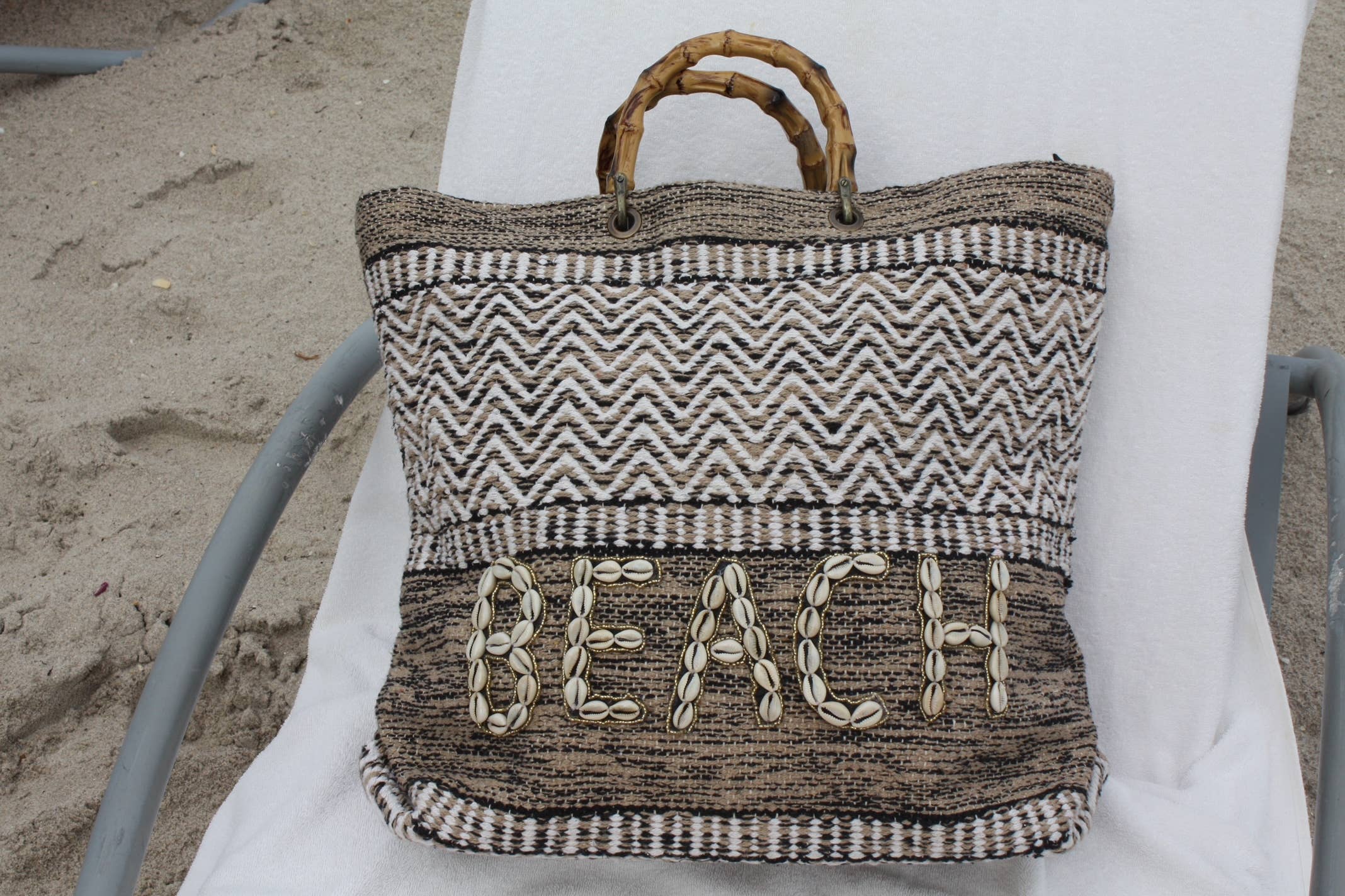 Large-sized bag made of cotton material with natural seashells. Lined with a zipper closure and internal zippered pocket.