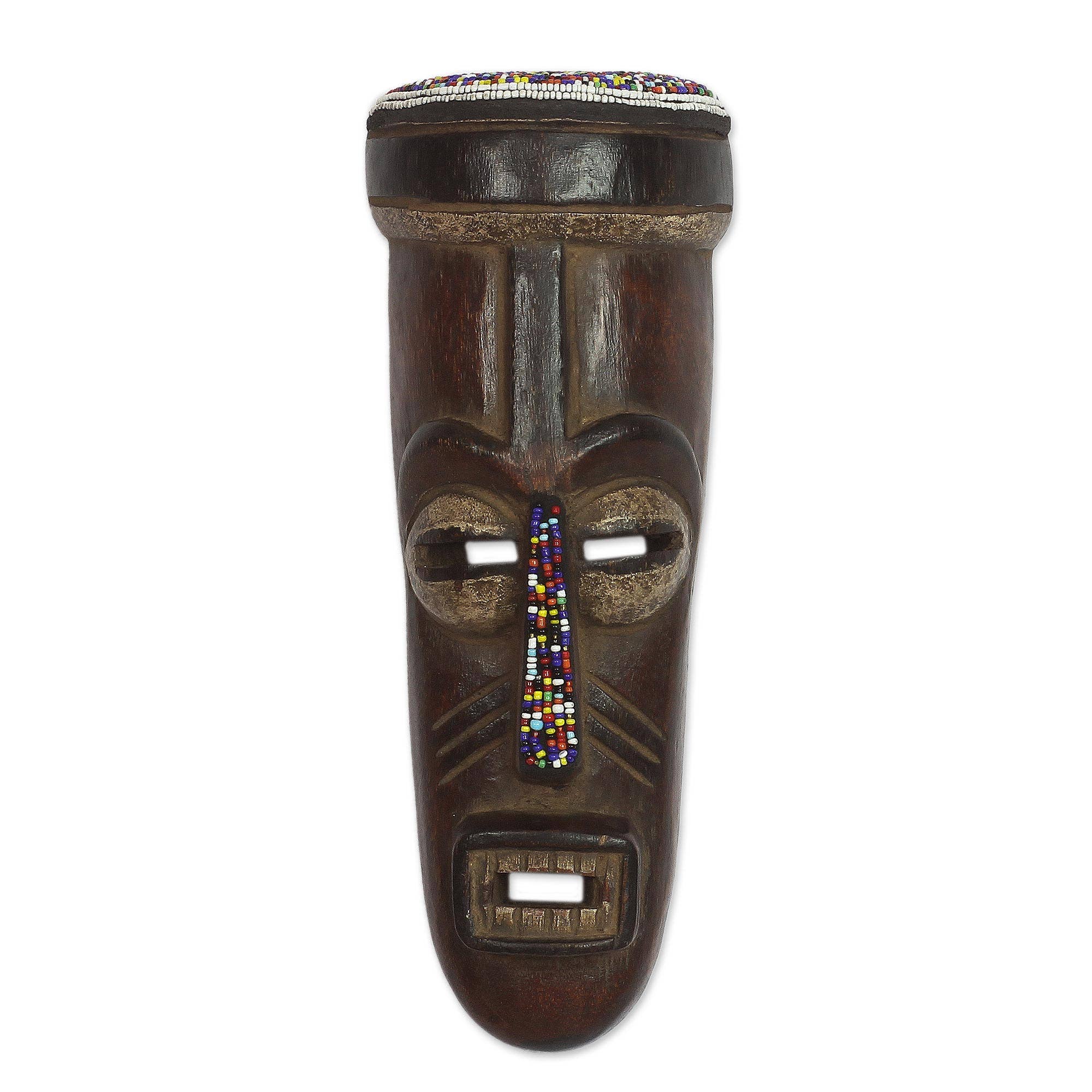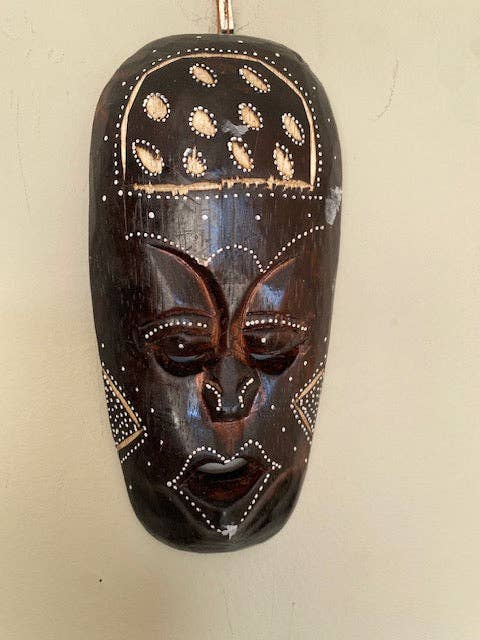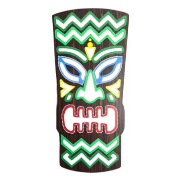 NOTE: Each mask is crafted by hand, size and color variations may vary by piece. Add a fun and colorful touch of tropical style to your indoor or outdoor decor with this set of five double tiki totem masks featuring different designs: a turtle, parrot, hibiscus, and two geometric shapes. They are made of sustainable wood, and hand carved to give them that fun tiki look. Each is painted with a brown base coat to make the colors and the face come to life. This set is perfect for bars, BBQ pits, the patio or any island themed oasis, and includes a built-in loop hanger on the back. Hang these approximately 5.75 inch long, 2.25 inch wide, 39.5 inch masks anywhere indoors or outdoors.