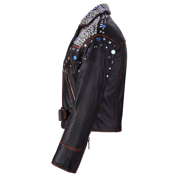 * Made from premium naked cowhide leather * Off white color can match outfit easily. * 2 exterior long zippered pockets on each side * 1 exterior buttoned stash fake pocket on front right for style * one piece panel on the back of of the jacket * Zippered front closure with snap at the bottom * Zippered cuffs