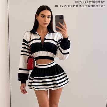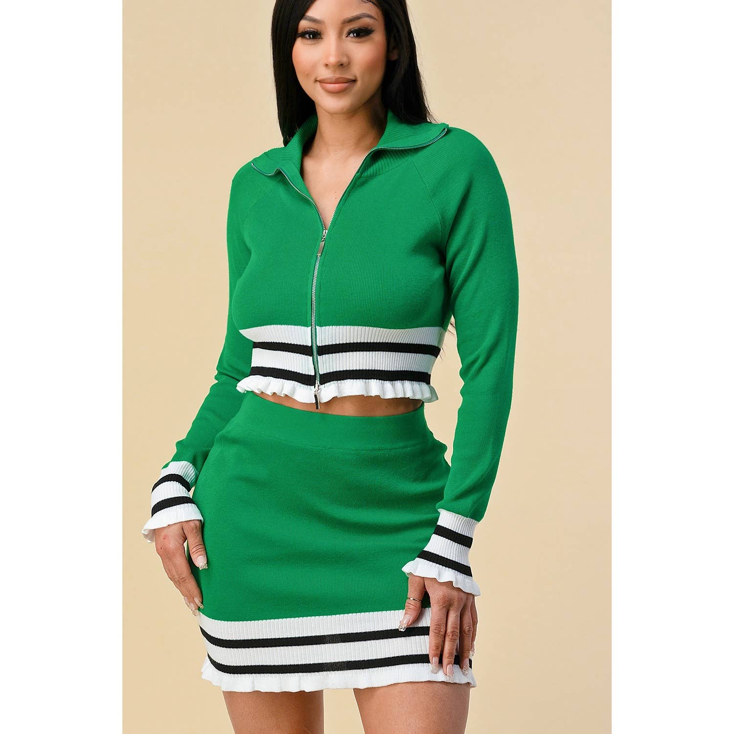 Introducing our two-piece set featuring a chic crop top with long sleeves and a matching mini skirt, designed with contrasting color accents on the trims and crafted from comfortable spandex material. Available in vibrant pink or classic black, the skirt features a zipper closure for ease of wear, while the crop top is adorned with stylish front buttons. This ensemble effortlessly combines fashion and versatility, offering a bold yet sophisticated look for any occasion. Model wears small size