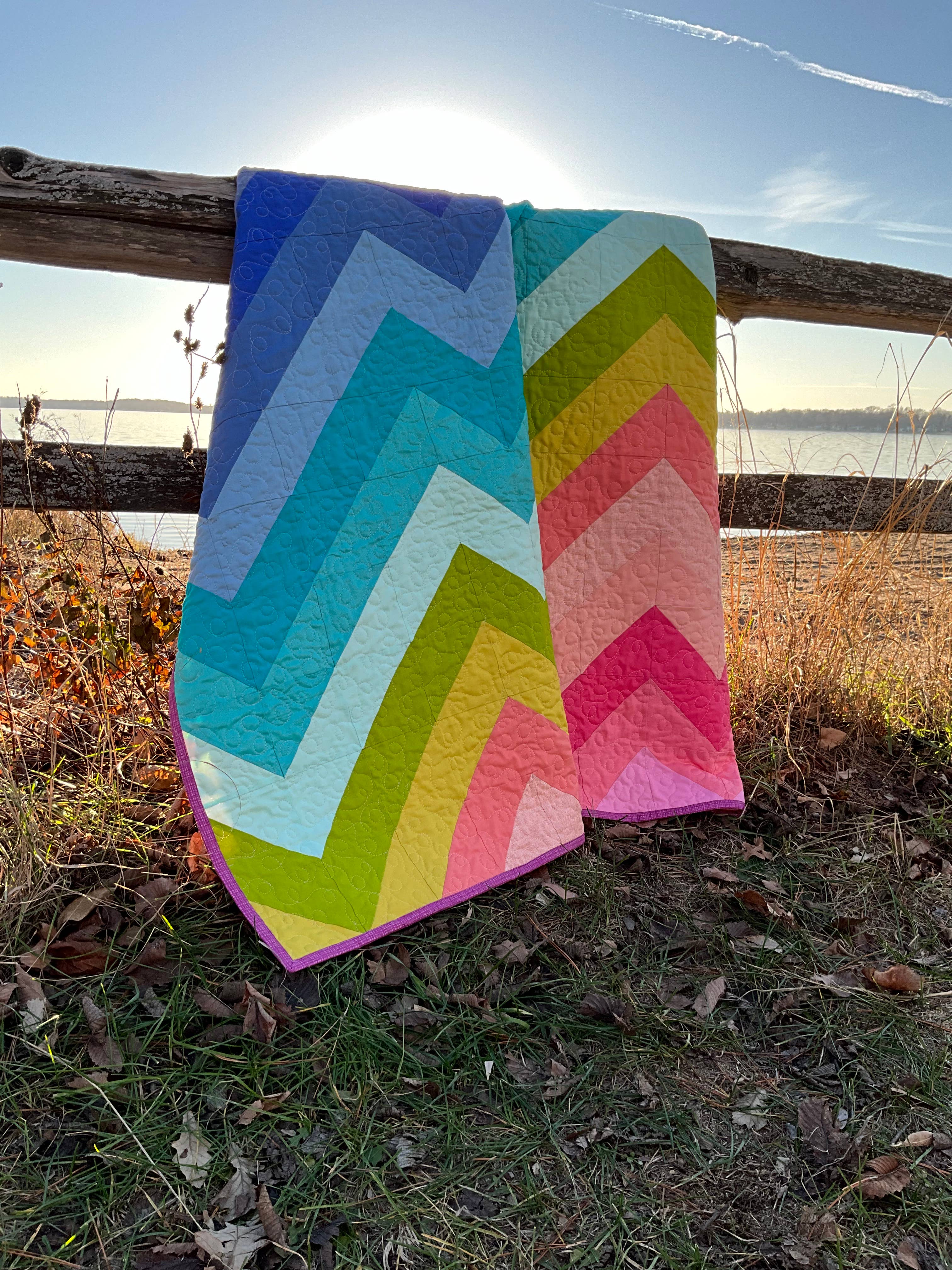 Basket Weave combines Tula Pink’s sumptuous colors and patterns from her True Colors line, a simple quilt block pattern set on point, and a dynamic color gradation for maximum impact.
