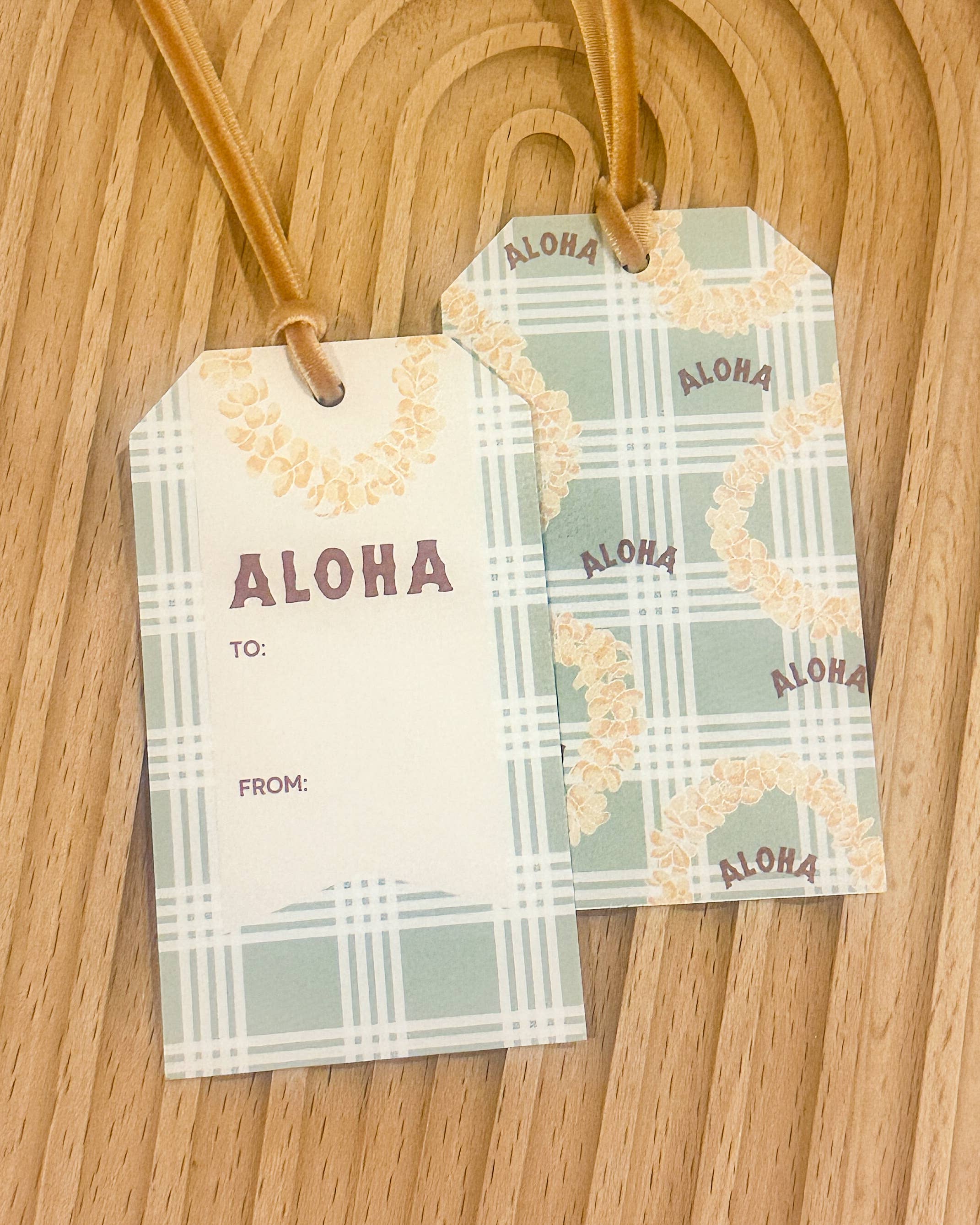 Add some aloha to your holiday celebrations with our Christmas Hibiscus pattern that features hibiscus flowers in a fun red and green color way. The deep red velvet ribbon adds a classic touch. The background of the design is a deep muted green. Each set contains paper 5 gift tags in a banner shape. Tags are easily attached to gift bags, gift boxes, or baked goods and other holiday treats. 1 set of 5 paper gifts tags with deep red velvet ribbon Gift tag size: 2" x 3.5" (not including ribbon) Design featured on back and front of gift tag Packaged on a paper backing card for easy in-store display (no plastic or cellophane)