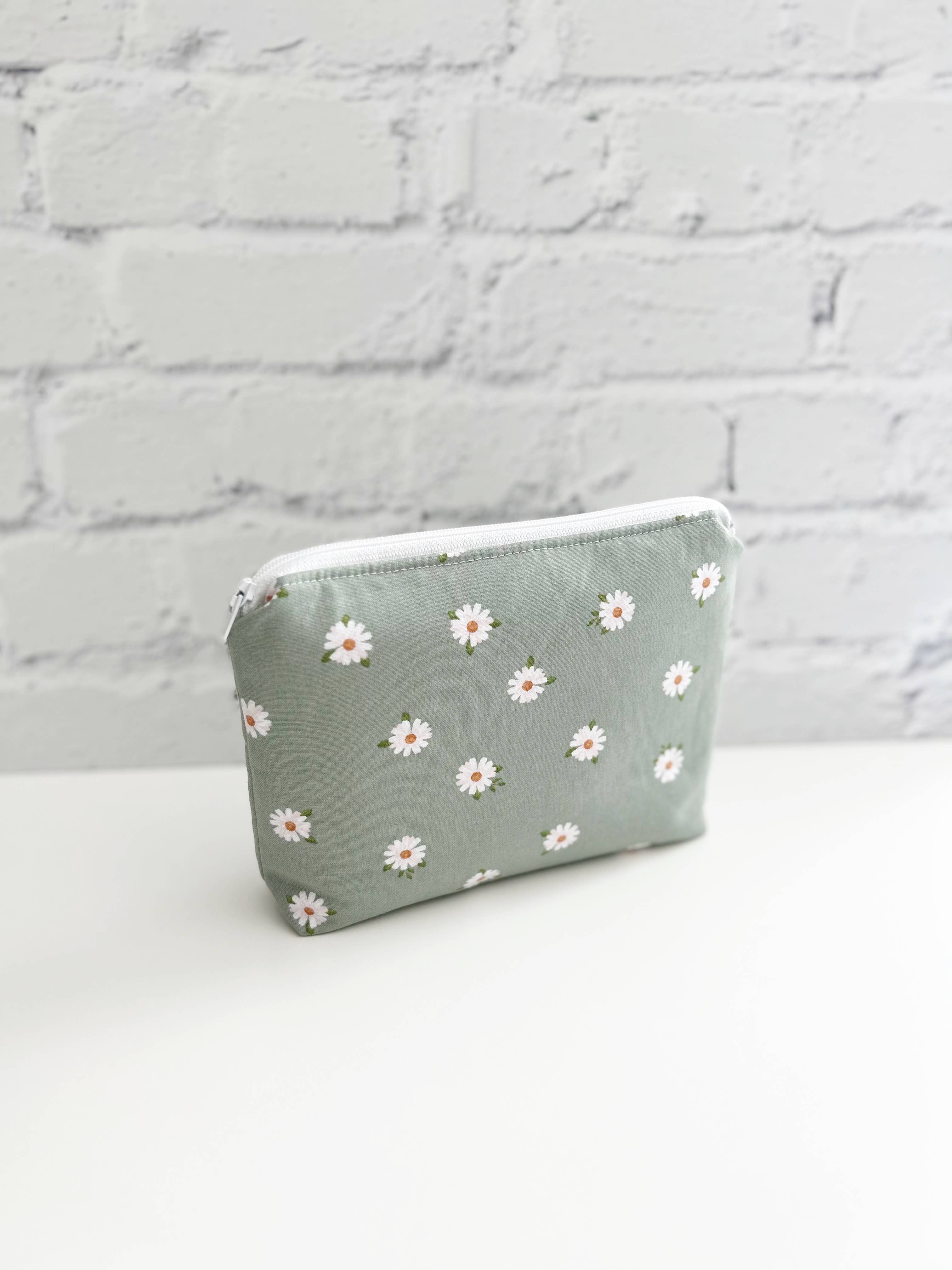 This bag is made with quality quilting cotton with a thick interfacing to give it structure. Inside the bag it’s made with polka dot quilting cotton. Zipper is a nylon YKK zipper. Details: Approximately 7x6 inches and 1 inch in depth to help it stand up.