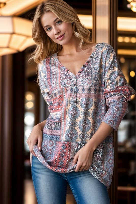 This is top is gorgeous! It is cut small so size up! I love it and my customers love it even more! It's a burst of color in my shop!