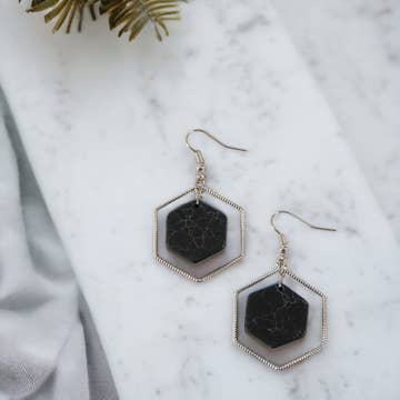 18k gold plated brass hooks with synthetic howlite and brass bars. Each earring weighs .51 oz. and measures 3 inches in length from top to bottom.