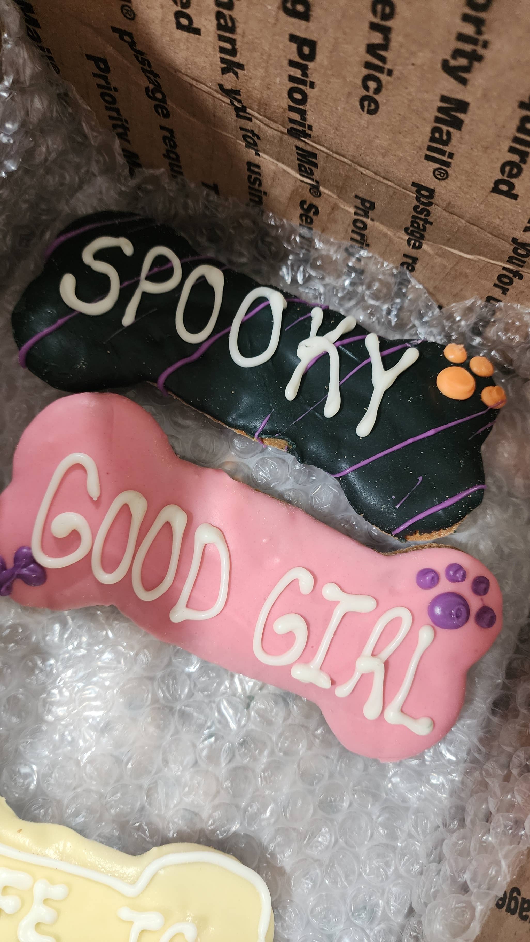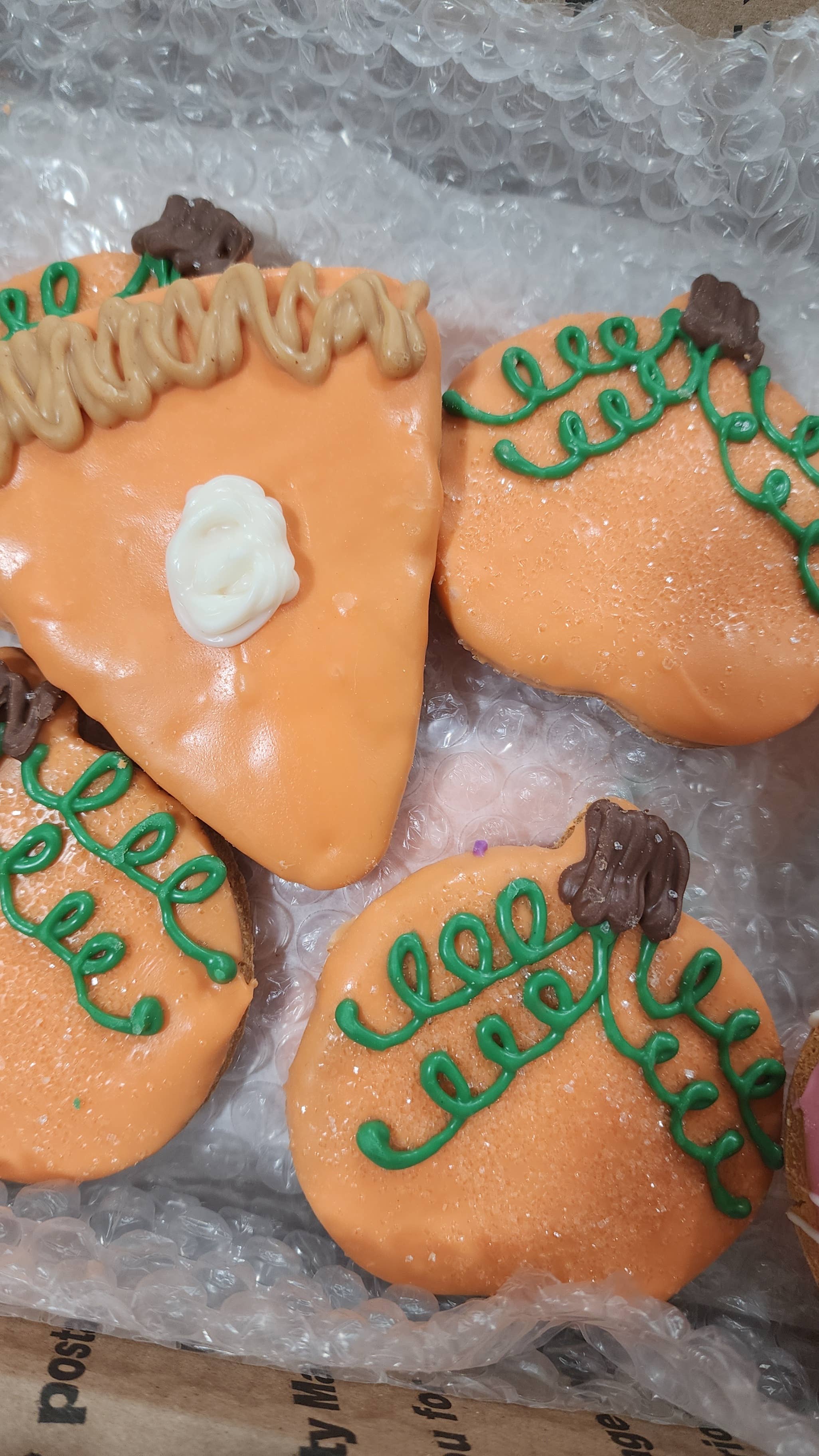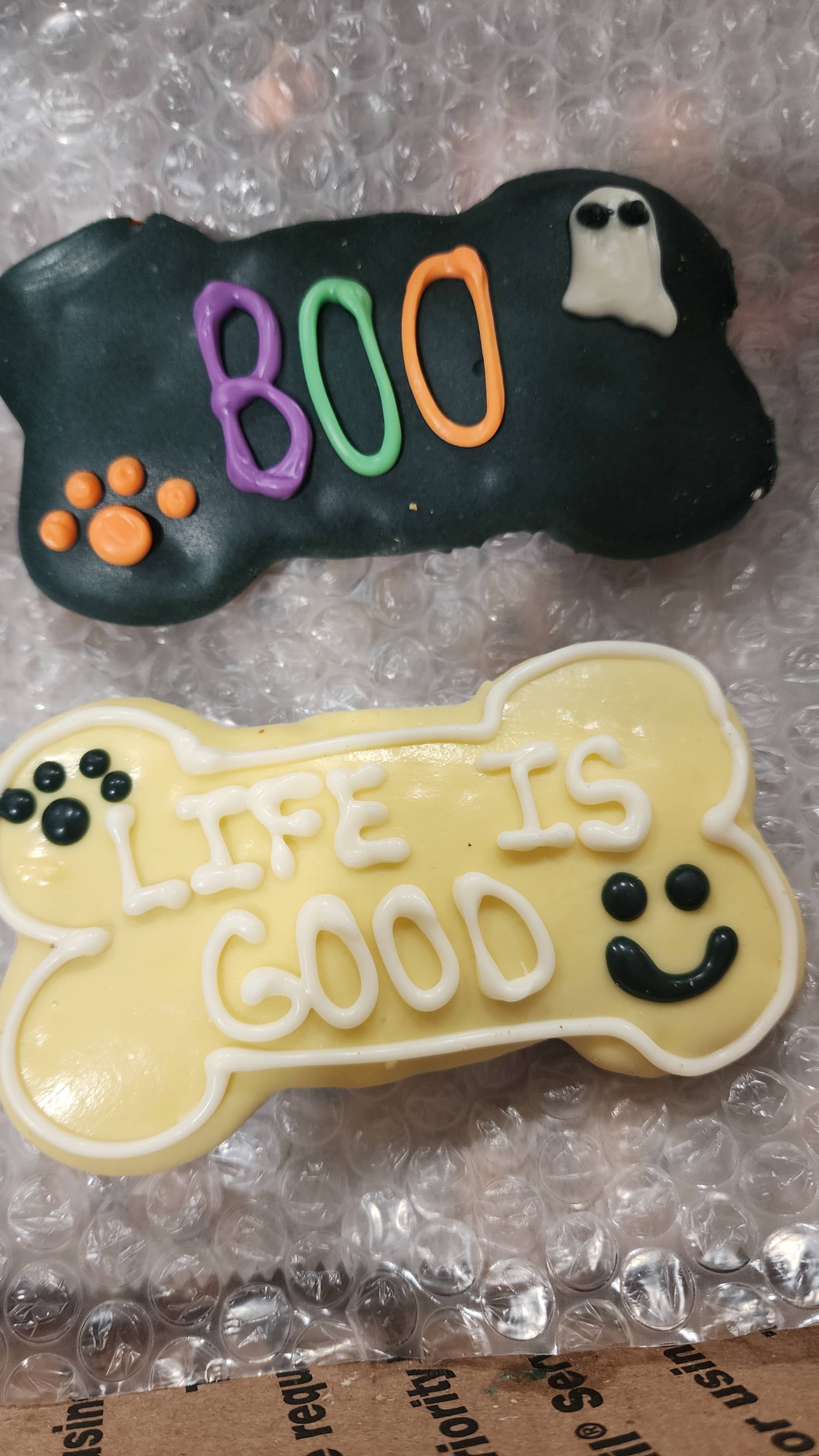 The colors are vibrant & the icing is well done. Nice thickness = less breakage. Good size cookies, no surprises & they smell yummy! You do have to package yourself. The information given for the cookie is the best I've seen. Ingredients, description & dimensions are so important, not only to me but to the pet owners. I have been looking for this quality cookie for a long time. Their fulfillment speed is a huge plus. Reasonable shipping but I hope Faire adds them to the Insider Shipping program.