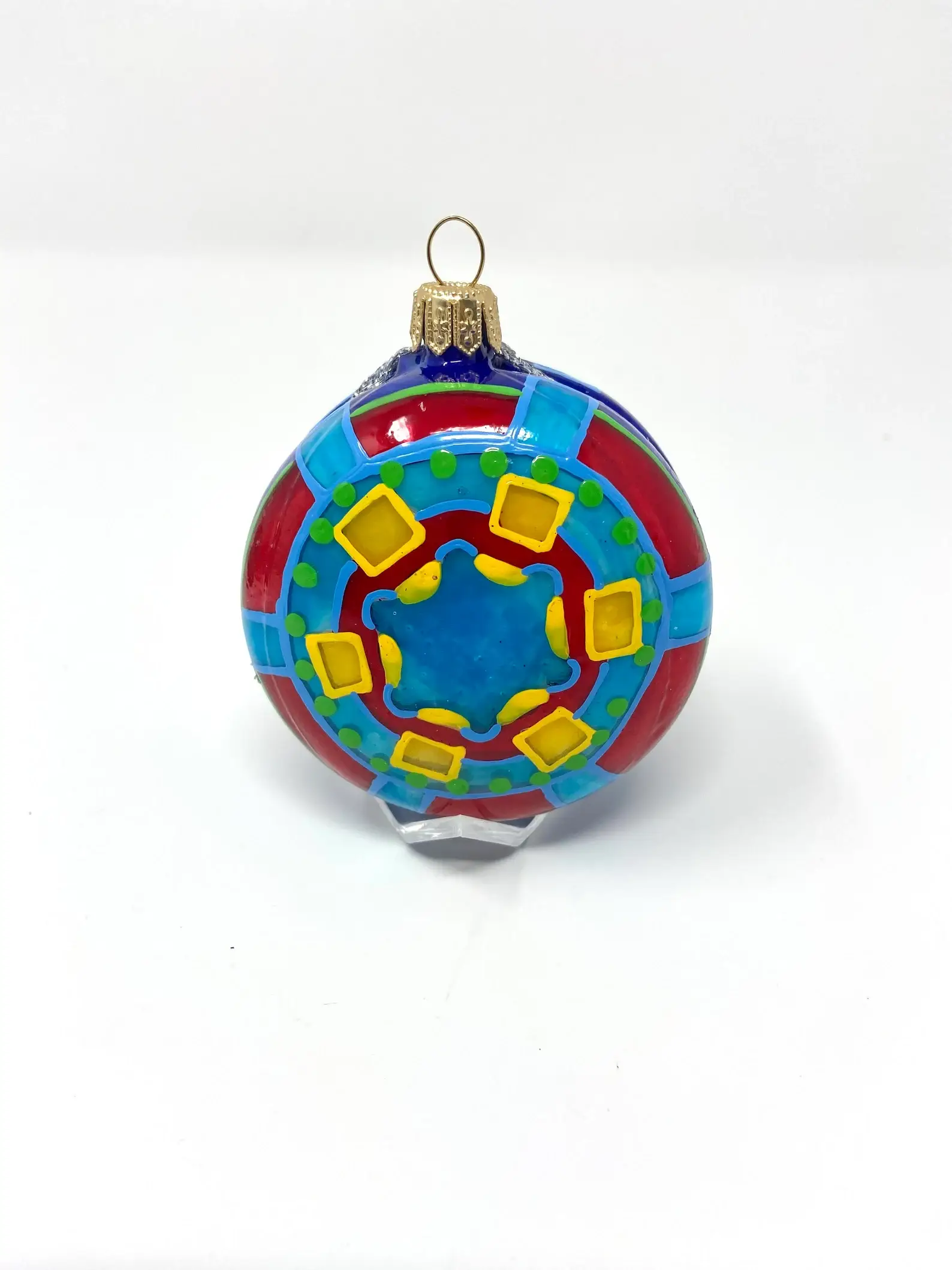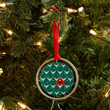 Bring the joy of a handmade quilt to your customers’ holiday celebrations. Our originally designed quilt ornaments are exclusively made by our designers. 50mm round with a 3” cord. Not available anywhere else. Original color drafted artwork is turned into a beautiful keepsake ornament. They are jewels of Christmas tree ornaments and a wonderful gift for all ages. Made in USA. Materials: Glass, Metal, Papier. Final Sale, Seasonal items are final sale.