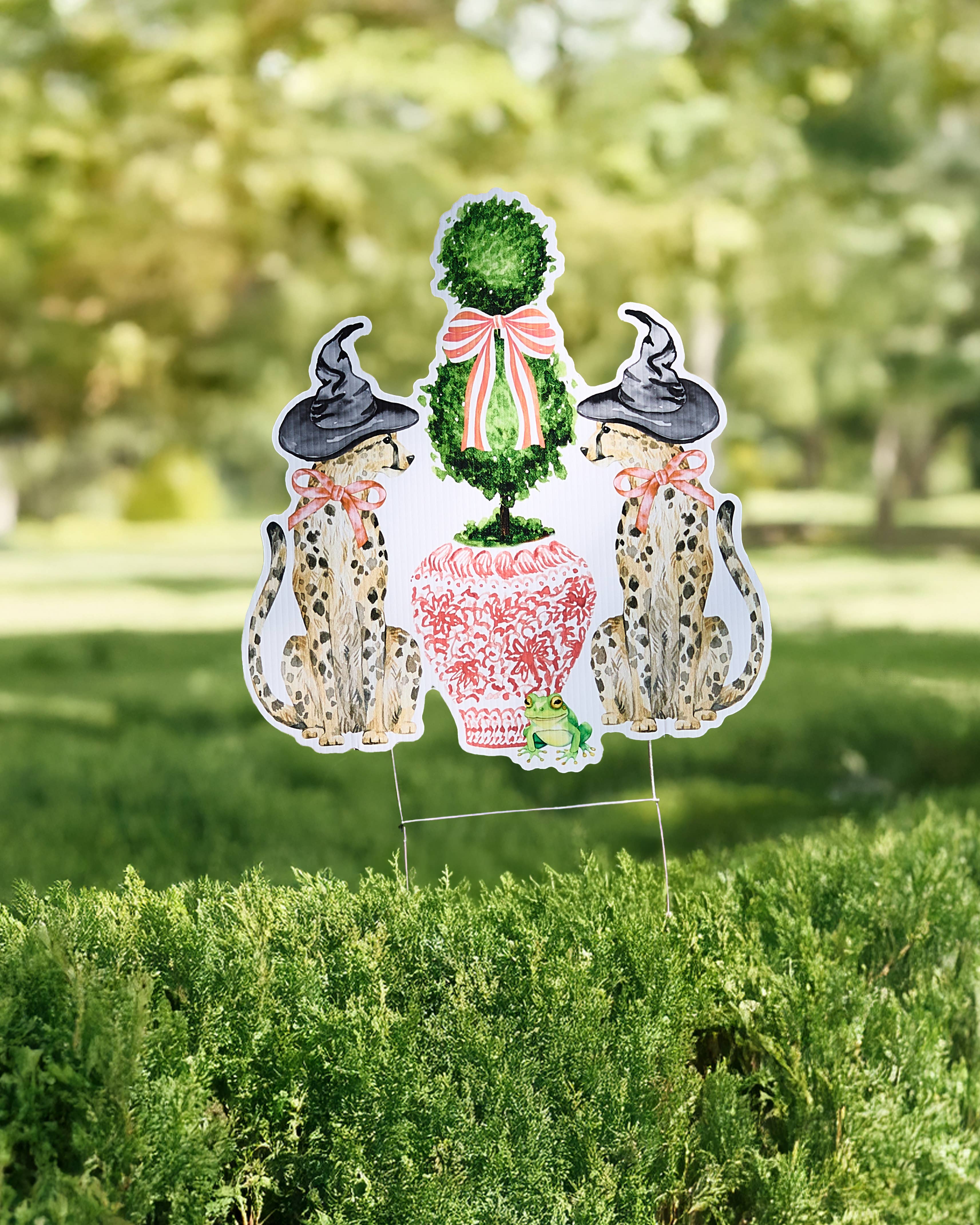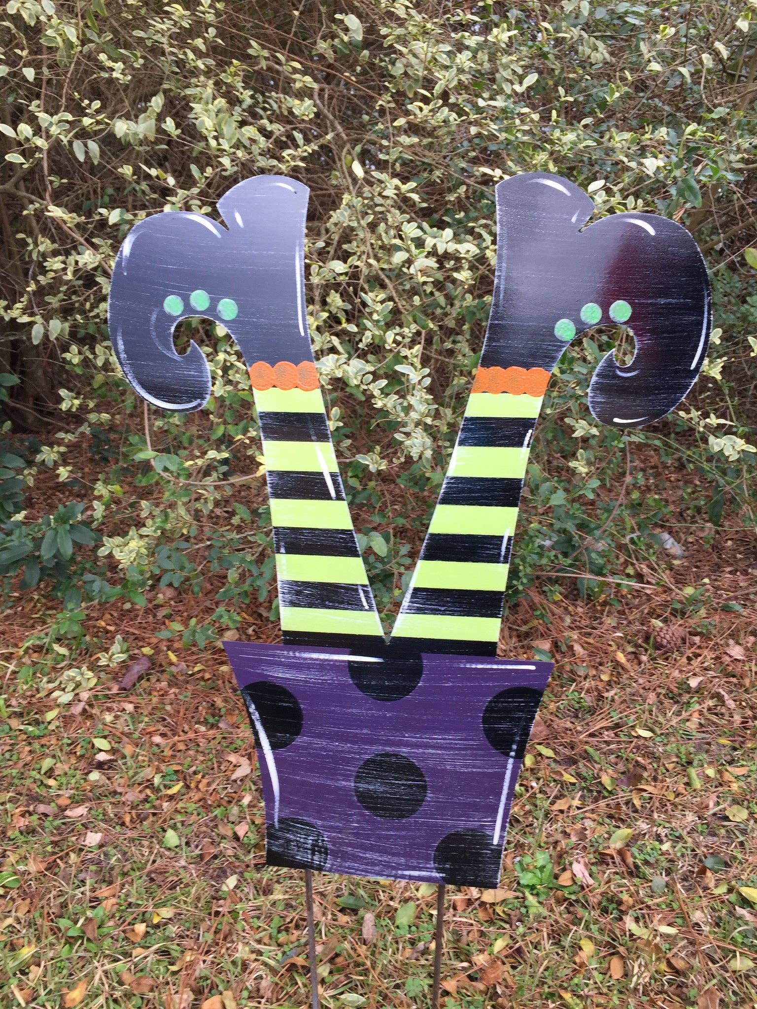 Add a touch of spooky fun to your yard this Halloween with this witch yard stake! This metal home decor is cut in the shape of witch legs. It comes in purple with black polka dots, and lime with purple polka dots. All of our door hangers and yard stakes are made with 1/8" thick aluminum composite sign material, which is widely used in the commercial sign industry. Each design is printed with UV- and weather-resistant paint to provide you with a full color image that prevents fading and scratching for years to come! 24x19"