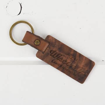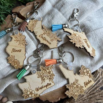 This beautiful HOME State keychain, featuring a leather strap, is both useful and practical. It's a wonderful souvenir or a great way to show pride in your home state. Each keychain has a leather strap, rivet, and keyring, and made from 1/8ā plywood that is laser engraved and has a matte finish. The leather strap and rivet colors will be a variety or what we have in stock.