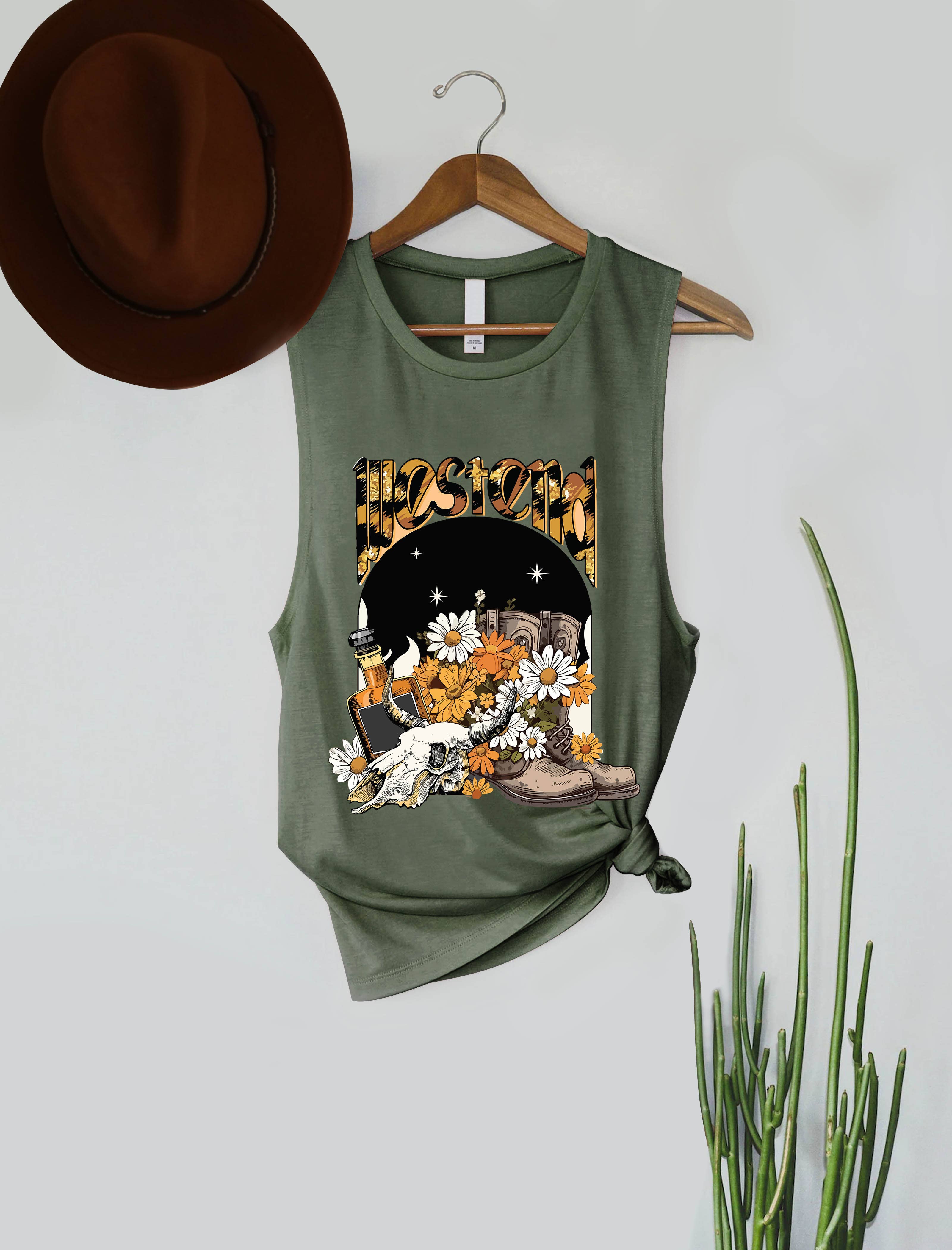 100% Cotton graphic tank top with an authentic vintage look and a softer feel that is only possible to achieve by using our special enzymes to dye and mineral wash processes - Pre-shrunk - Washing Instructions: - Wash in cold water recommended - No bleach and preferably colors alike - Tumble dry low - Model is wearing a size Small (LENGTH: 26.5" / BUST:34") Graphic tee & top garment dye. Screen printed t-shirts T SHIRTS , SHIRT, TANKTOP, COWGIRL, WESTERN, WILD
